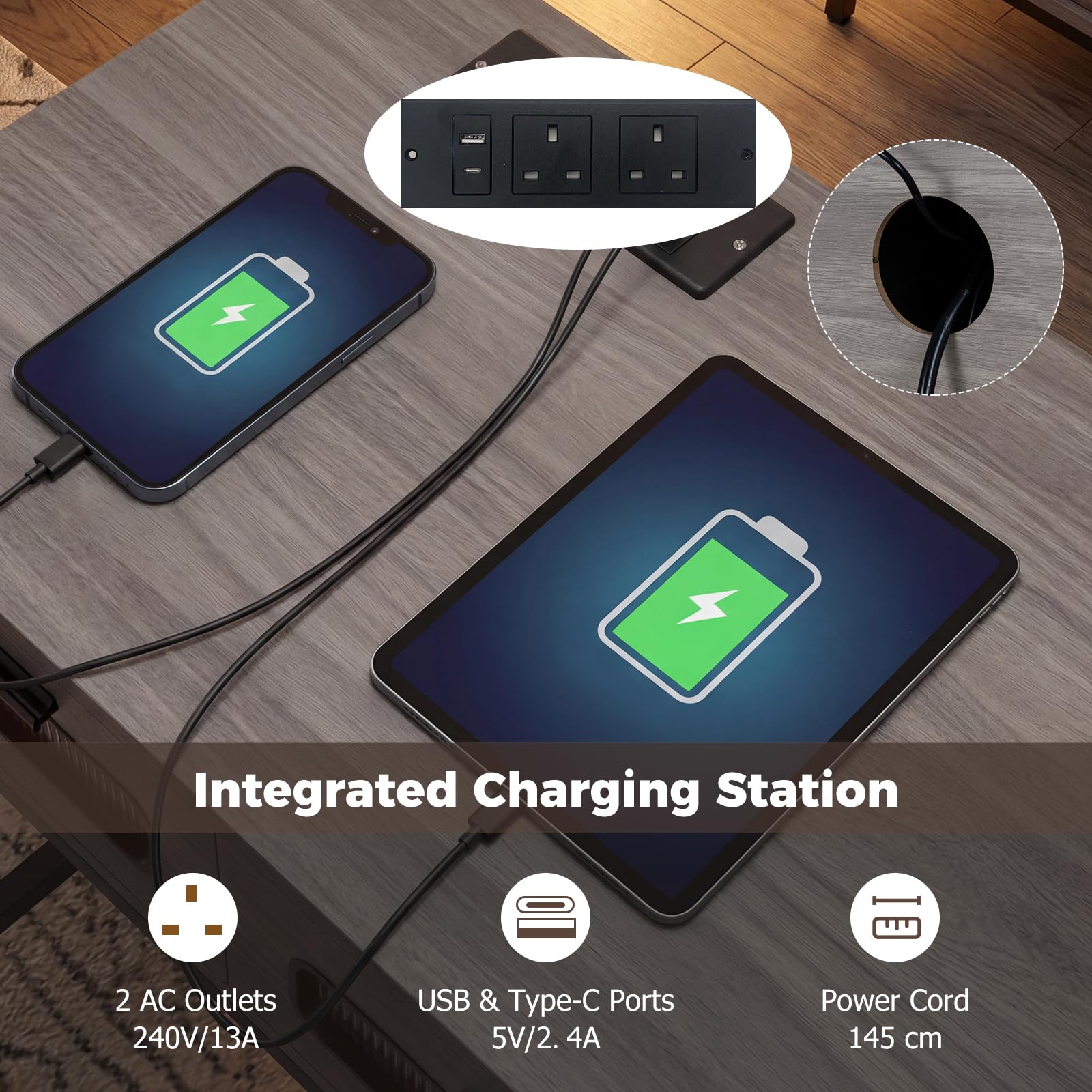 - Integrated charging station with 2 AC outlets, USB and type-C ports