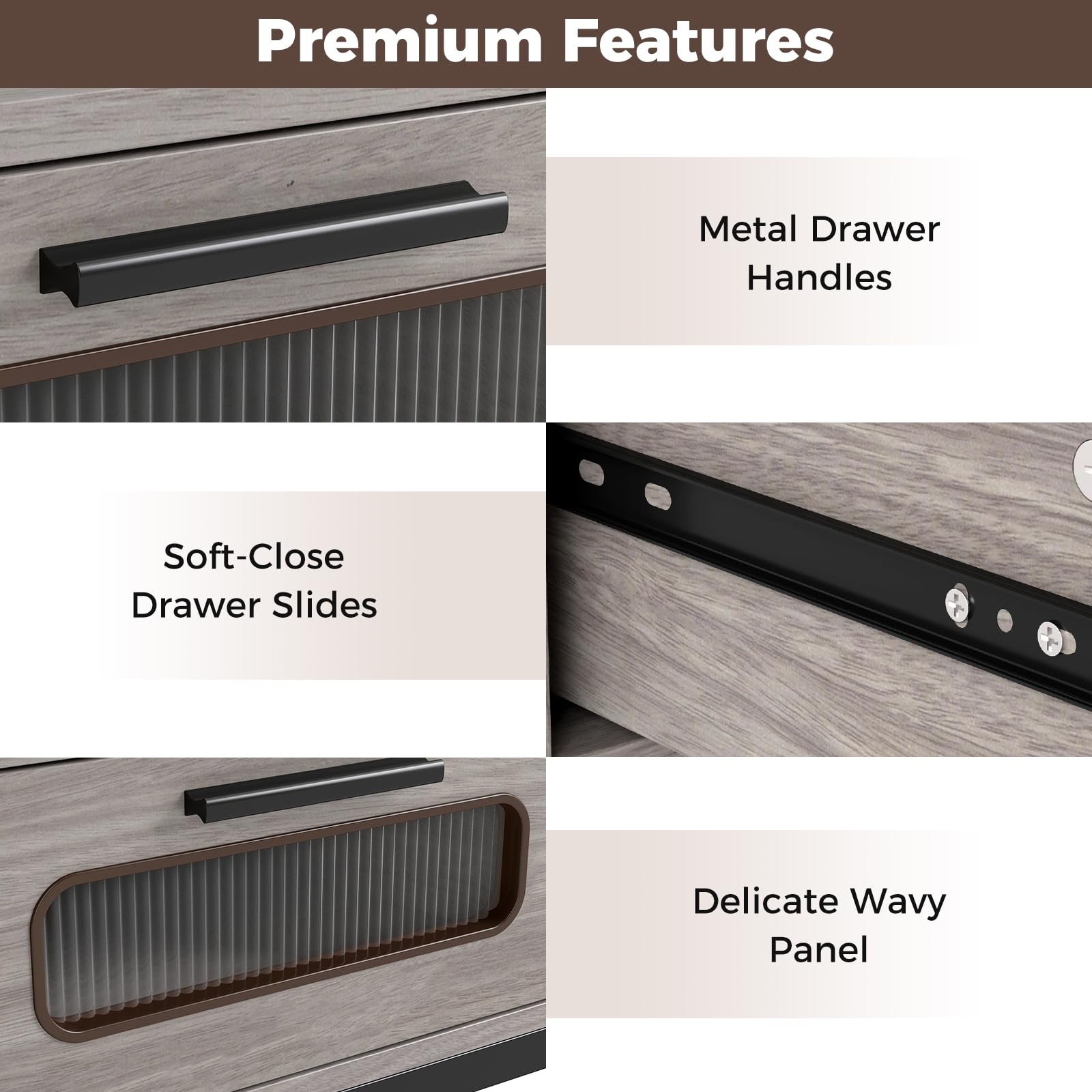 - Metal drawer handles and soft-close drawer slides for smooth opening