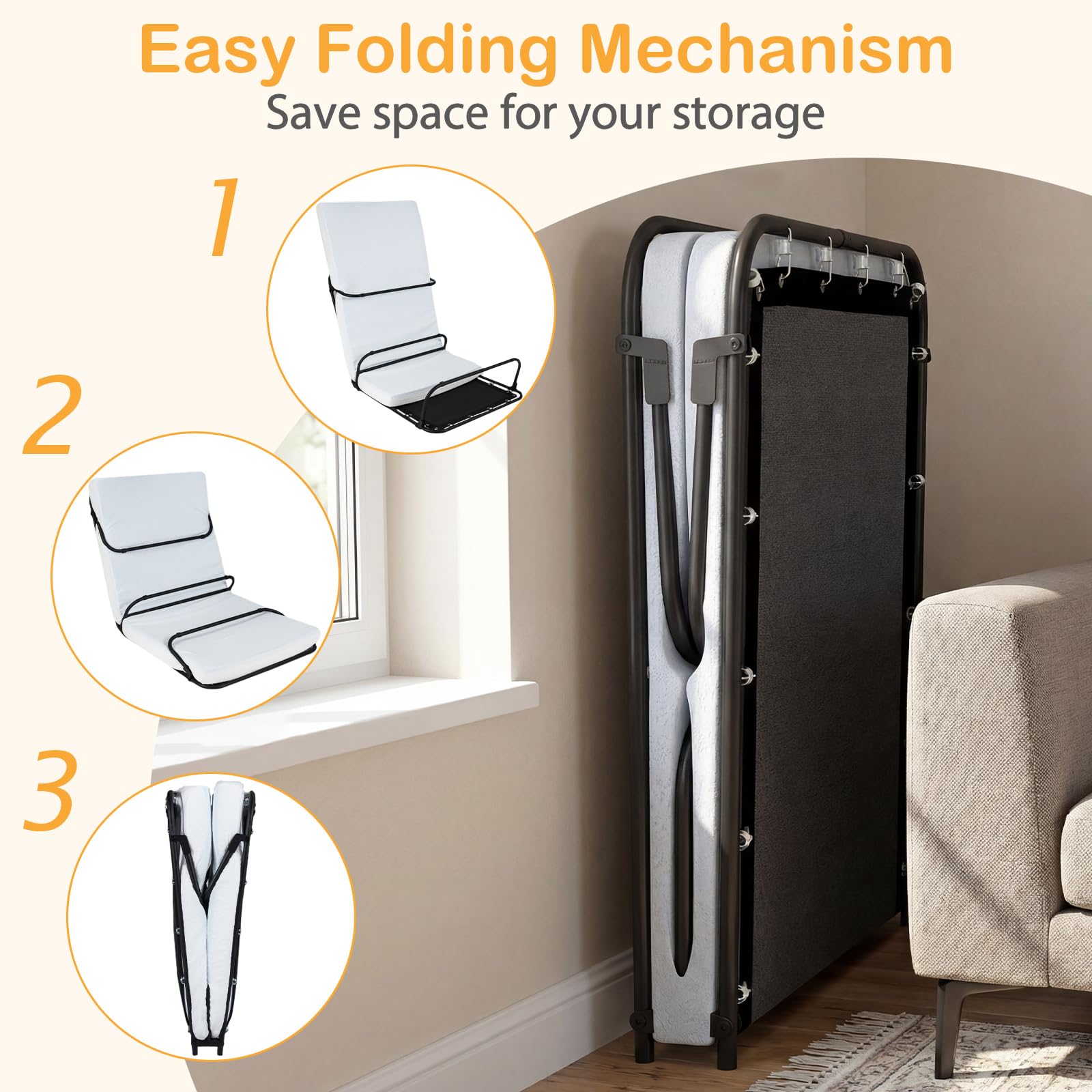 Thoughtful Functional Details: Well crafted with wear-resistant fabric and a detachable mattress cover for easy cleaning, this fold up bed also provides under-bed storage options, making it a practical addition to any room needing flexible sleeping arrangements.