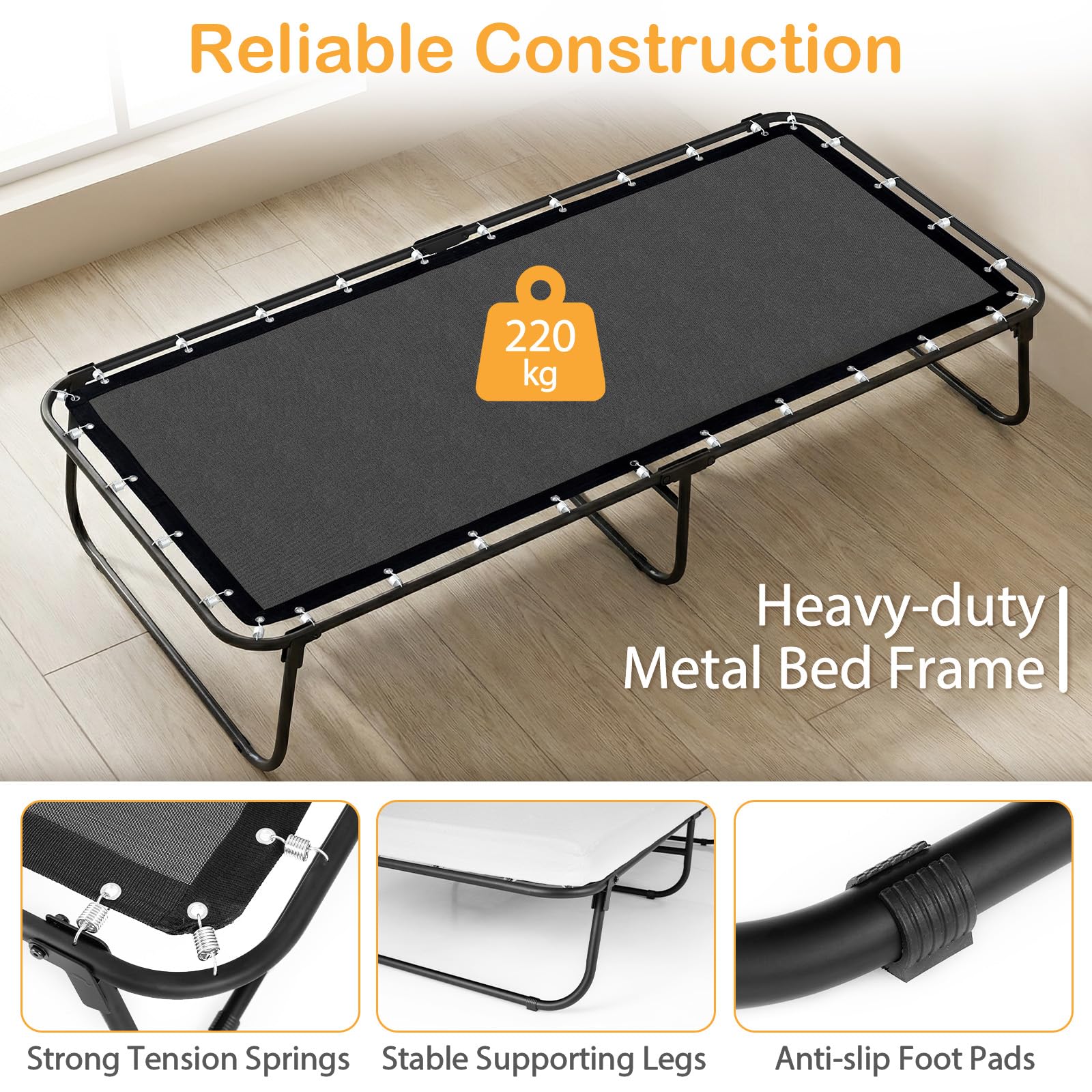 Reliable Construction: Built with a heavy-duty metal bed frame, strong tension springs and stable supporting legs, this folding bed offers great firmness, holding up to 485 lbs. Meanwhile, its anti-slip foot pads ensure stability and protect your floor.