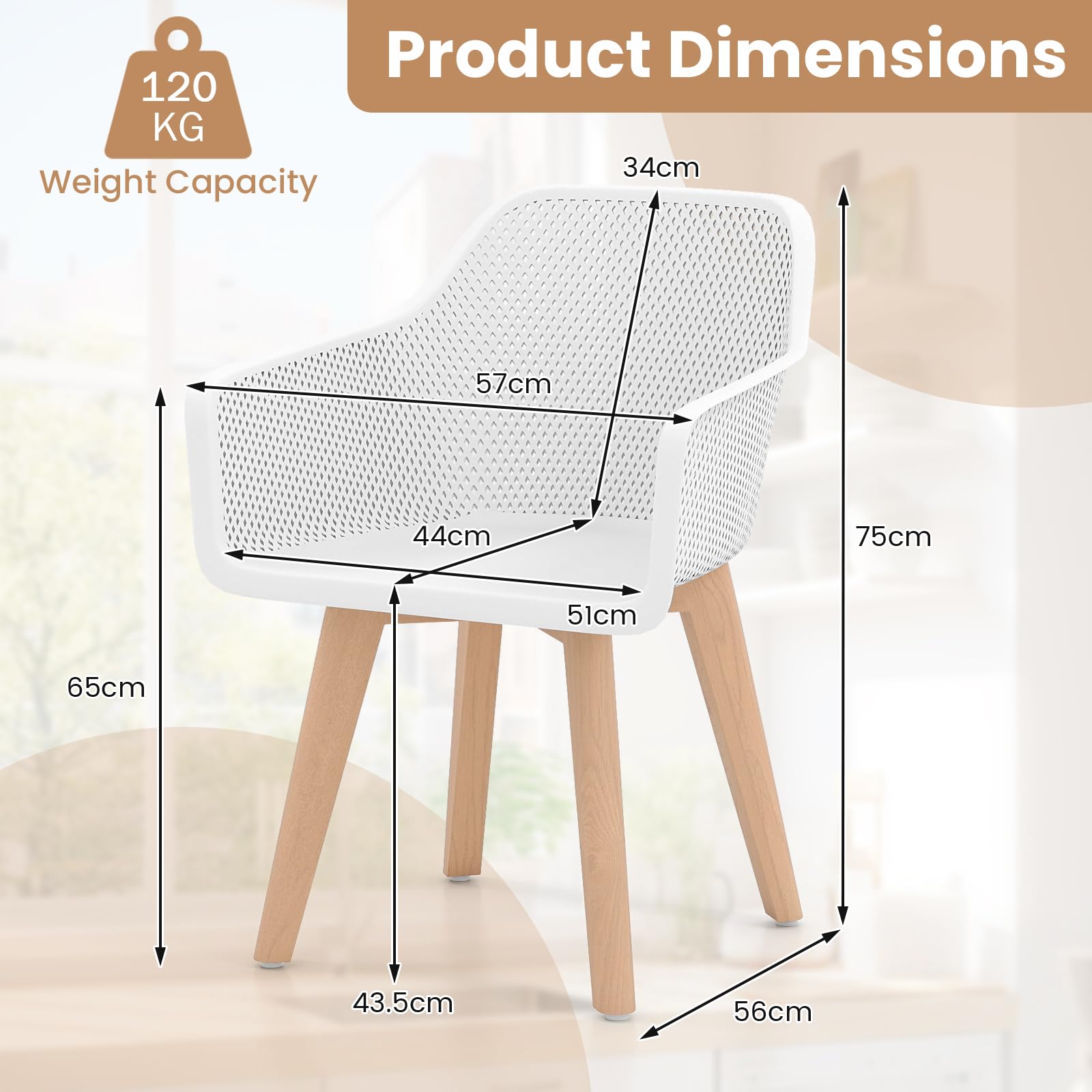 Boasting an ergonomically shaped, ventilated backrest that conforms to your body, the kitchen side chair delivers excellent support along with a refreshing, breathable feel. The inclusion of armrests and an ample seat size further boosts comfort, making the accent chair ideal for extended dining or work sessions. Its sturdy legs, fashioned from high hardness beech wood, ensure outstanding durability and reliable support. Both the seat and backrest are made of premium PP material, offering a smooth, waterproof surface that's effortless to keep clean. Additionally, its versatile and stylish look enhances any settings, fitting seamlessly into living rooms, dining areas, or studies for a chic, modern touch.