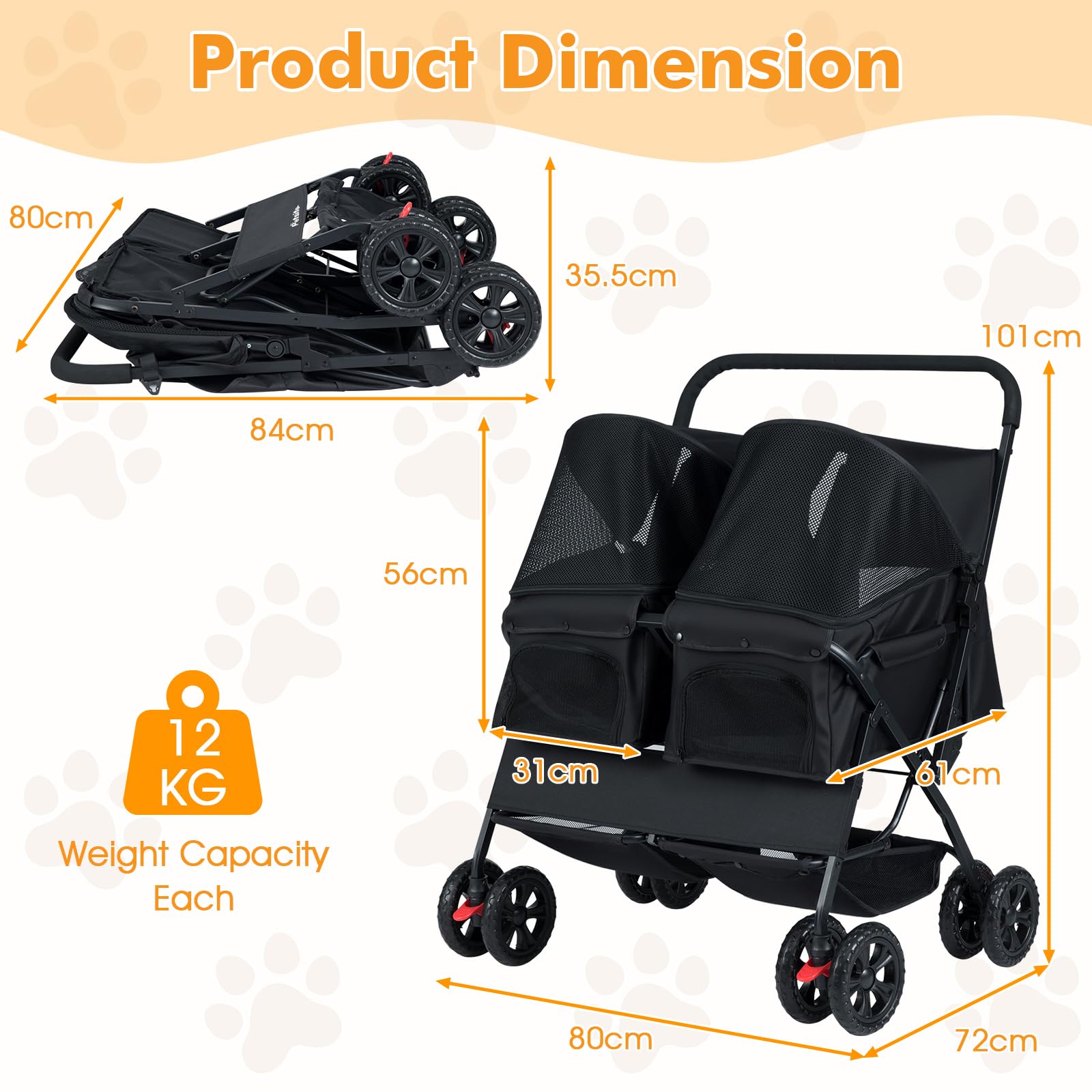 Experience comfortable outings with your furry friends using the double pet stroller. The double-seat carrier makes it ideal for families with multiple pets, ensuring each companion has their own cozy space. An adjustable sunshade is 180° retractable to provide protection from the sun and regulate airflow, while a safety leash helps prevent unexpected escapes. Plus, breathable windows ensure a fresh environment, while the removable and washable pad ensures a clean and inviting environment for pets. Storage and transport are simple thanks to a folding design with a locking mechanism for secured closure. Moreover, shock-absorbing universal front wheels combine with rear wheels with brakes allow for steady and smooth rolling. The 4 side pockets for small essentials and 2 spacious baskets are perfect for carrying treats or pet supplies on the go.