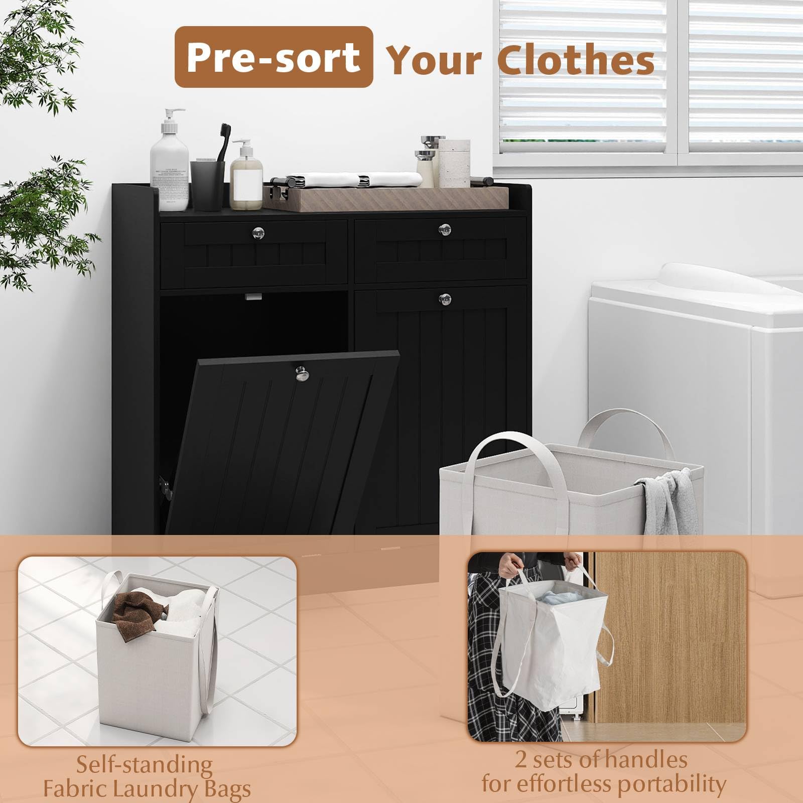 Portable & Accessible Laundry: This laundry cabinet features quick-access tilt-out doors that open to reveal 2 fabric laundry bags. Each bag has a self-standing base and 2 sets of handles for effortless portability, making laundry day quicker and more organized.