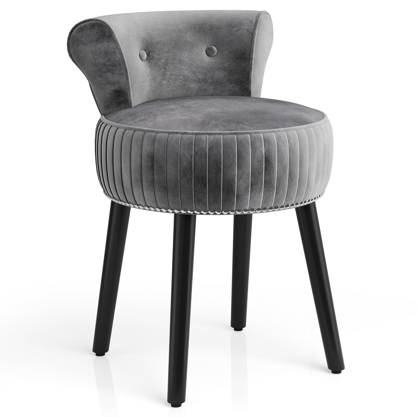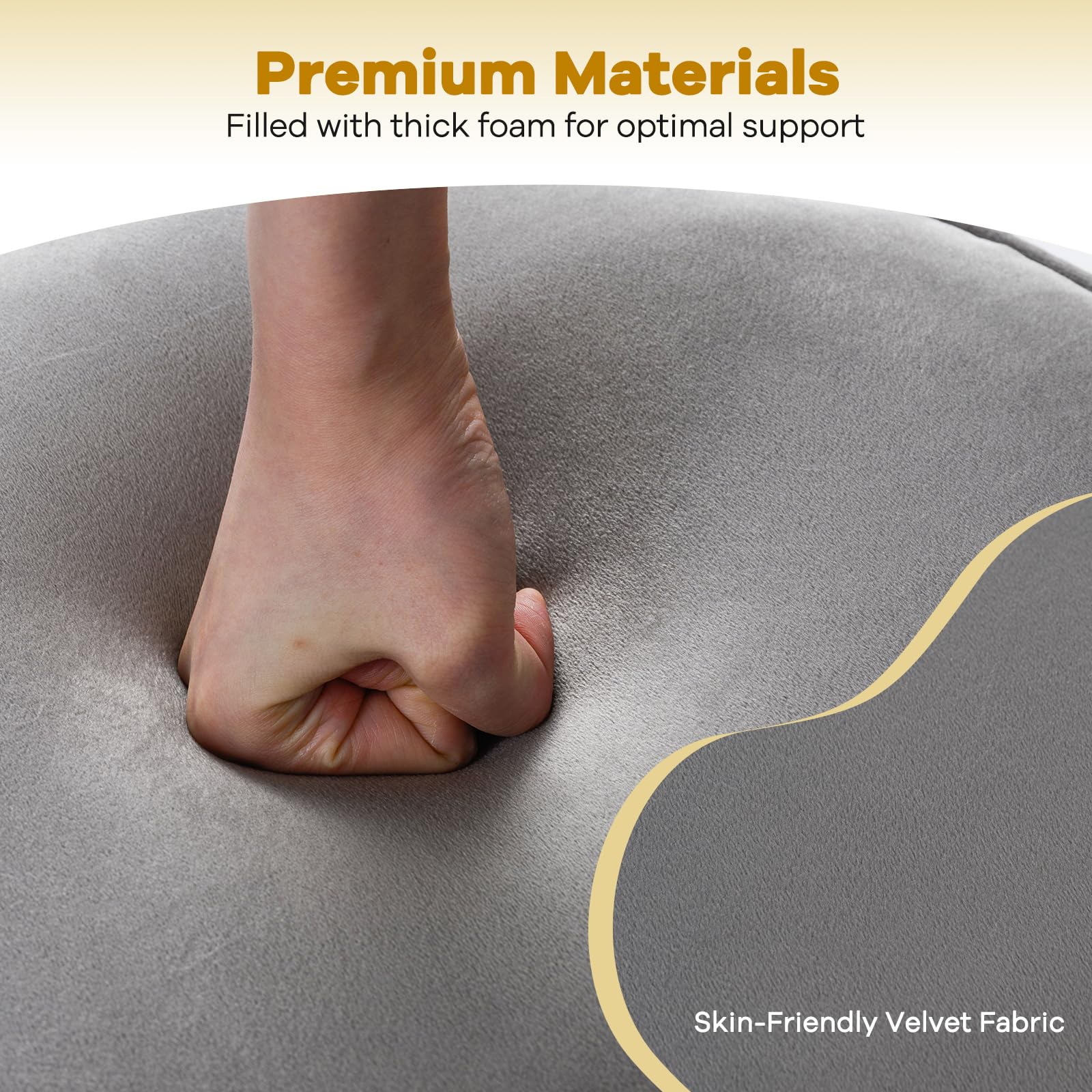 Upholstered in skin-friendly velvet, the makeup chair offers a silky-smooth and comfortable seating experience, with thick foam filling in both the seat and backrest for enhanced support. The ergonomic low backrest and gentle tilt ensure ample lumbar support, while the curved silhouette cradles your body for lasting comfort. Constructed with a solid wooden frame and sturdy rubber wood legs, this dressing table stool for bedroom offers dependable durability.