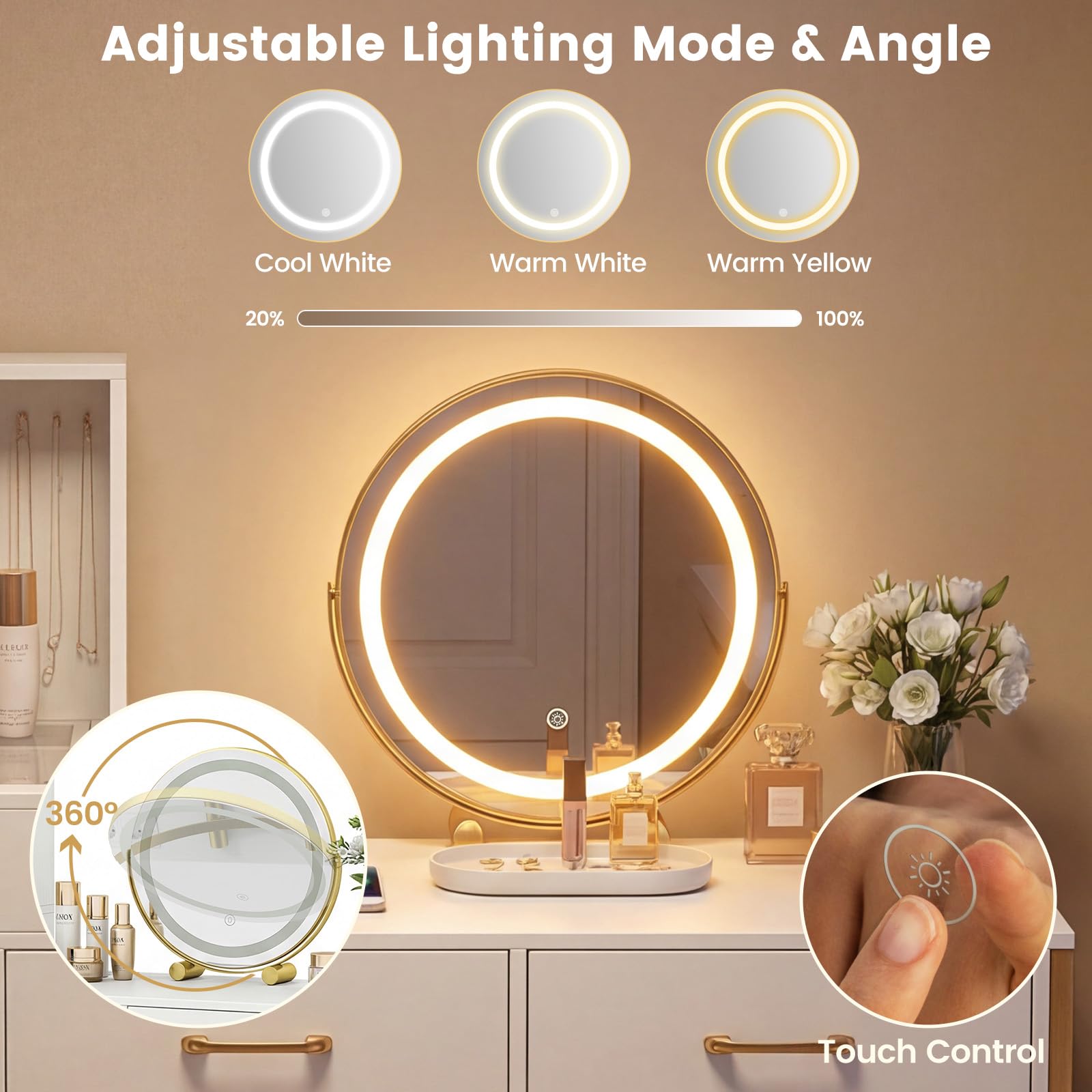 The LED vanity mirror can rotate 360°. Featuring 3 lighting modes and adjustable brightness, the mirror provides perfect illumination for makeup application. The upper glass desktop ensures a sleek and easy-to-clean surface. 1 drawer with dividers, 1 open compartment, 1 cabinet with shelf, and 2 large drawers offer ample storage for cosmetics and accessories. 3-level adjustable shelf makes it suitable for items of different heights. Additionally, you can organize your jewelry with 120 ring slots and 10 necklace hooks, keeping your favorite accessories within reach. The dressing table with mirror and stool set also comes with a cushioned stool, making the makeup experience more enjoyable. Our make-up table is ideal for your bedroom or dressing area, helping you stay organized and look your best every day.