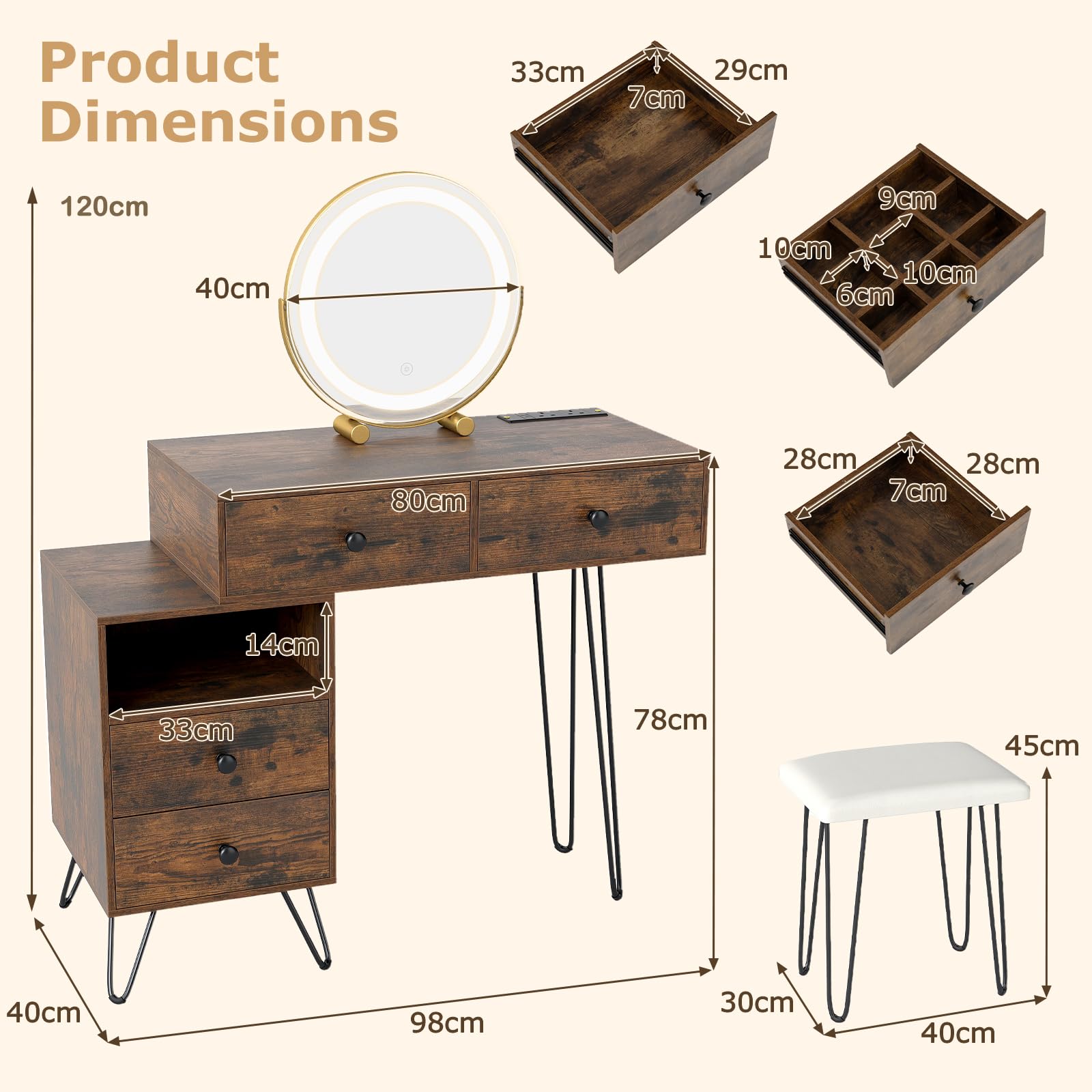 | Package Includes | 1 x Dressing Table, 1 x Stool, 1 x Instruction |