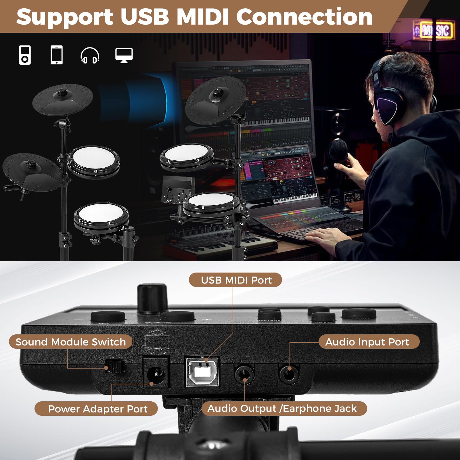 Power Supply & Easy Connection: The power adapter offers continuous charging. There are various jacks (power adapter port, audio output /earphone jack, and audio input port) of drum module that can be compatible with power, headphones, computers, and other devices. It can also support USB MIDI connection for endless creativity.
