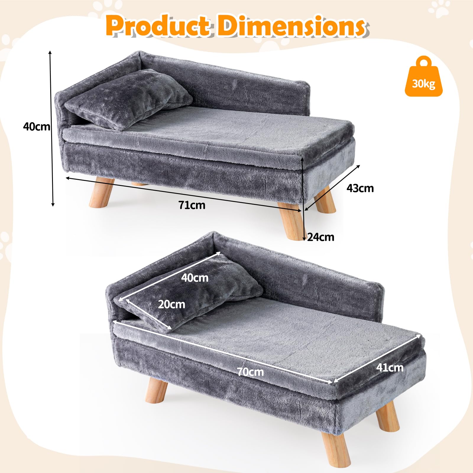 Perfect for Small Pets: The elevated pet sofa measures 71 x 43 x 40 cm (L x W x H) and the resting area measures 70 x 41 cm (L x W), with a loading capacity of 30 kg, ideal for pets like cats, puppies and medium dogs. Not only is it a comfy resting spot, but its stylish design effortlessly complements your home decoration.