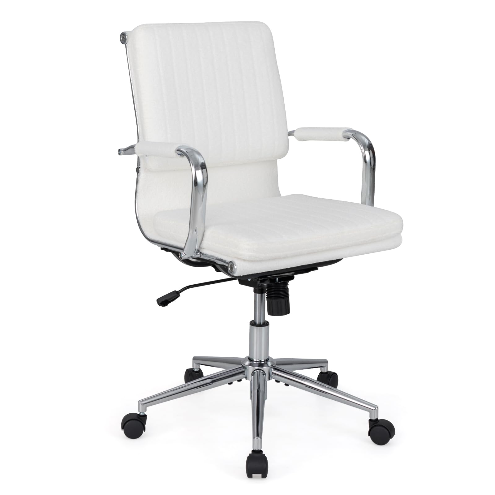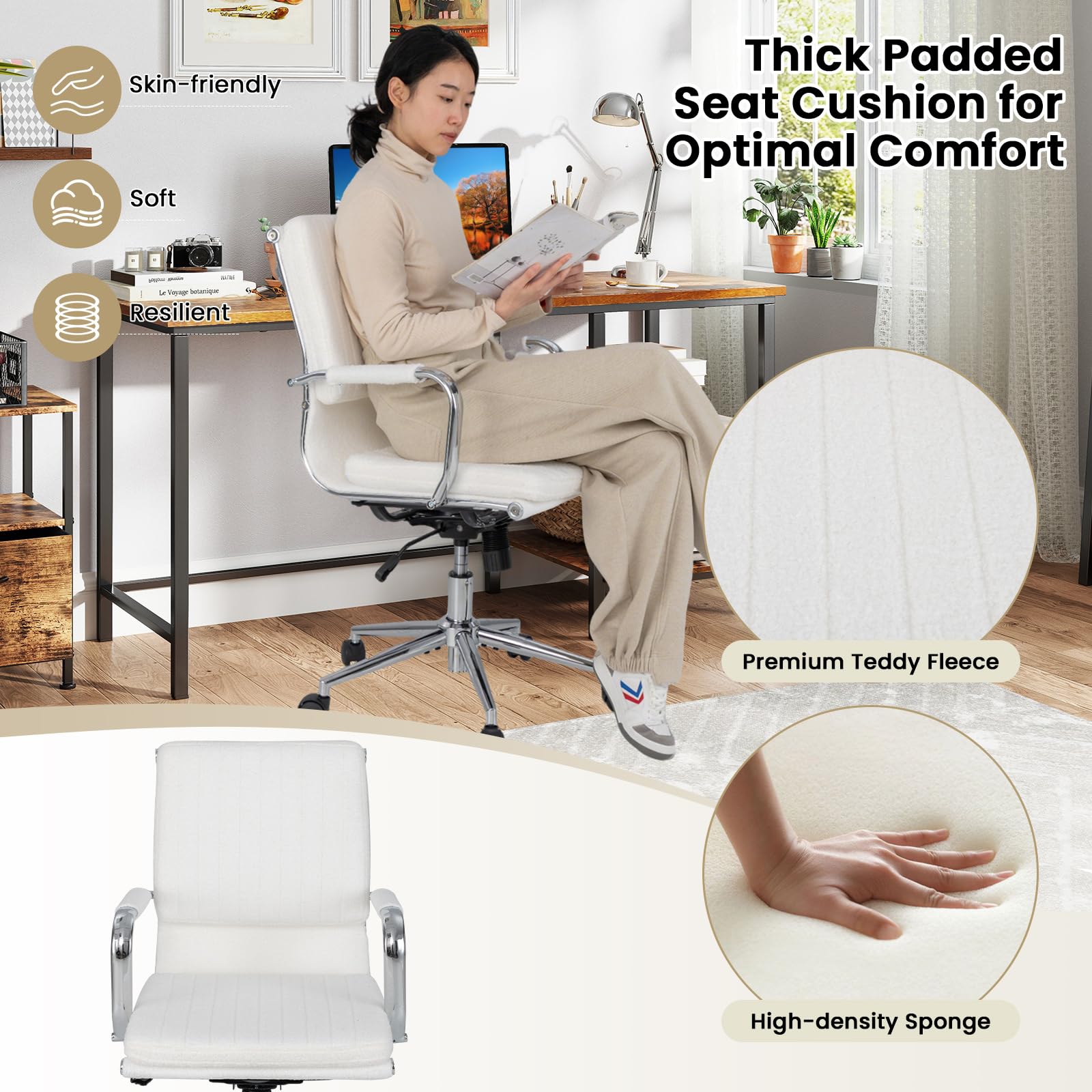 Luxurious Upholstery for Comfort: Upholstered in premium teddy fleece, the accent office chair offers a touch of luxury and warmth. Additionally, the thick sponge padded seat and integrated armrests enhance comfort, providing a soft yet supportive sitting experience.