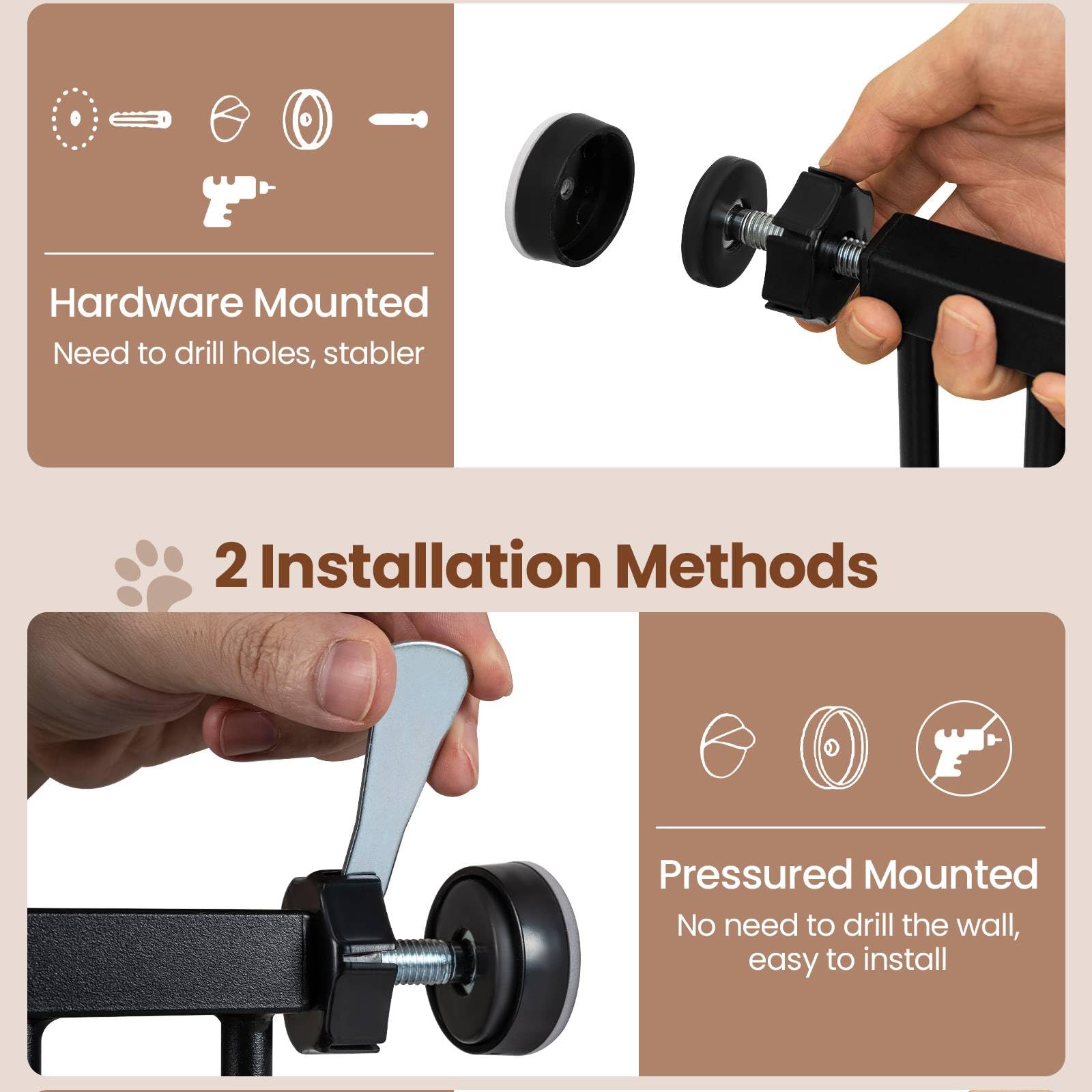 2 Installation Methods: The dog gate is equipped with 4 adjustable pressure mounted kits for a no-drill installation, perfect for temporary or semi-permanent setups. Alternatively, for more permanent and stable solutions, hardware mounted kits are also provided. Warm Tips: Please do not cut off the zip ties until the installation is finished.