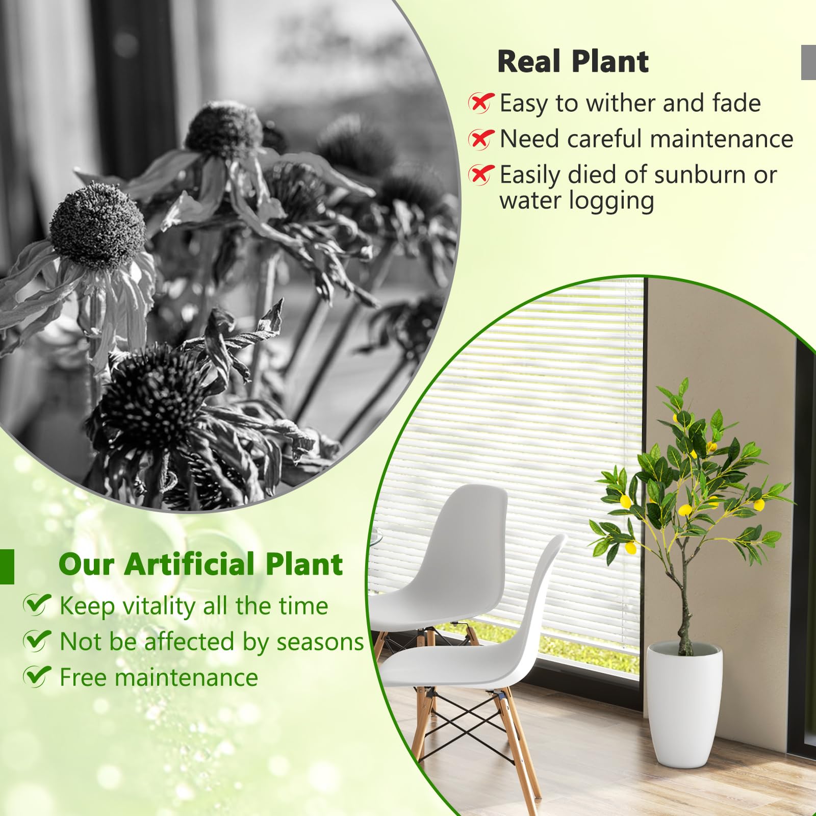 Realistic and Full-Bodied Appearance: The tall artificial lemon tree features vibrant and cute lemon fruits paired with verdant leaves, which mimics the appearance of a real lemon plant, bringing a touch of freshness to your home. And it is completed with simulated moss for an authentic touch.