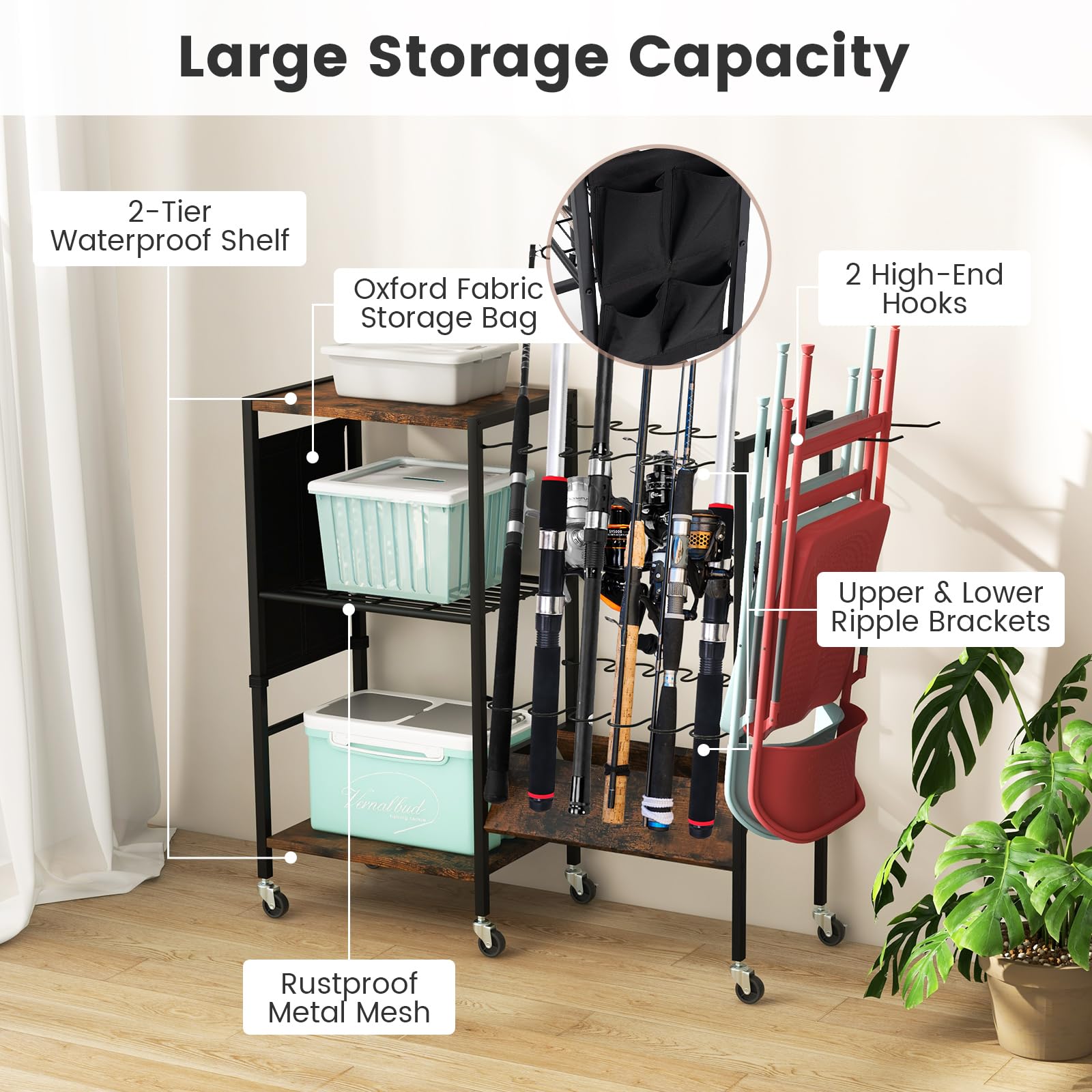 Large Storage Capacity: This fishing gear organizer is equipped with a 2-tier waterproof shelf, a rustproof metal mesh, an Oxford fabric storage bag and 2 high-end hooks for all your fishing equipment, such as your fish box, bait box, fishing chair, fish net, etc.