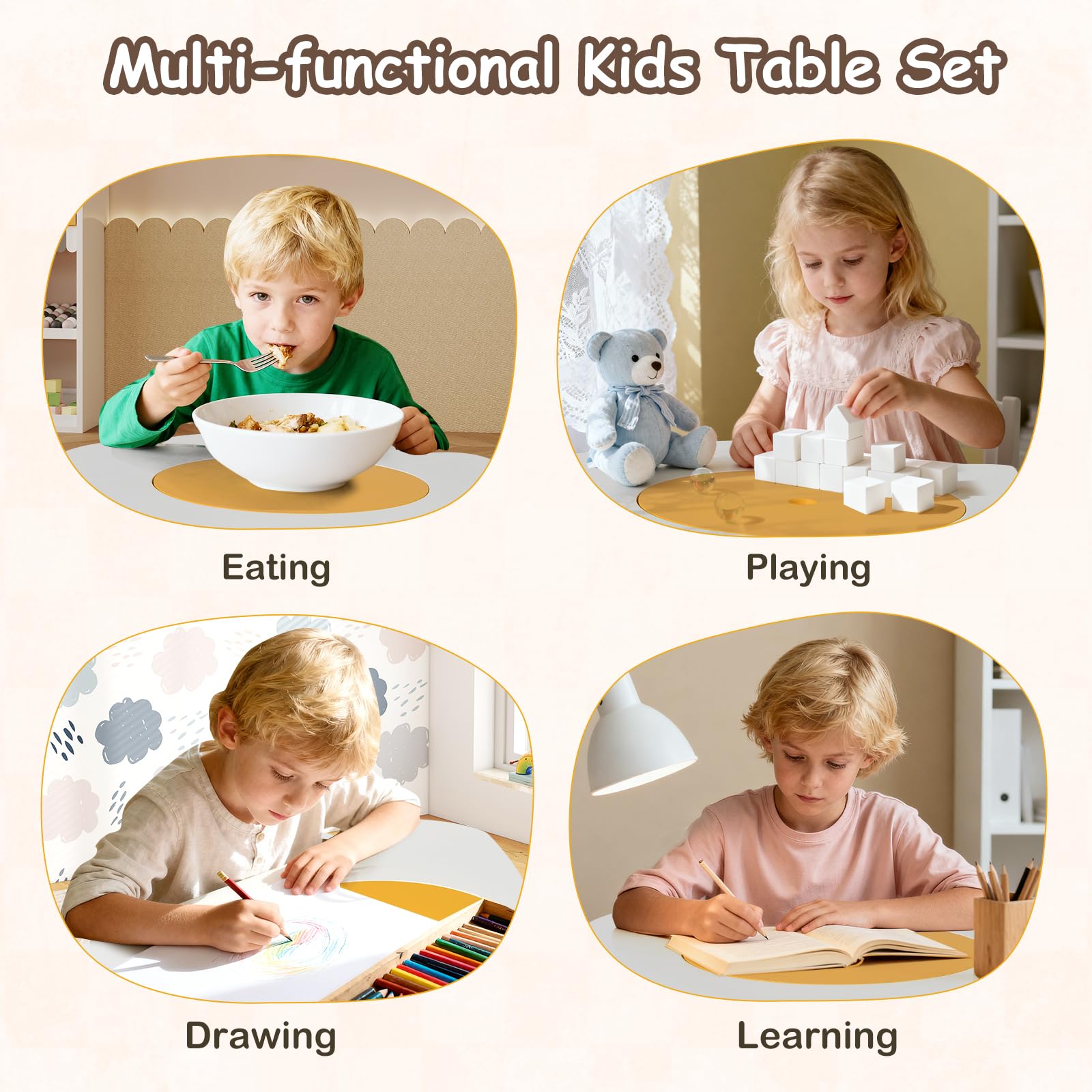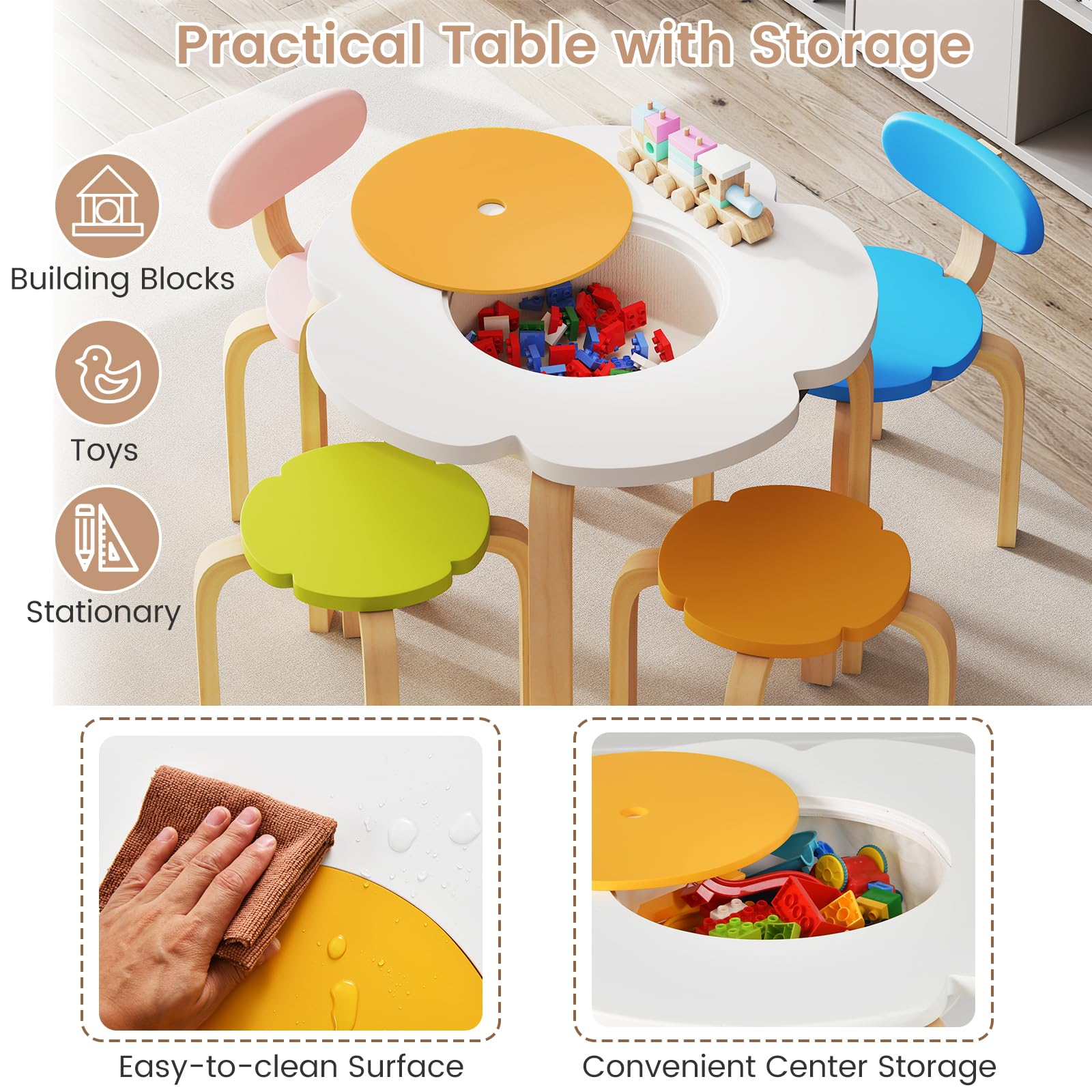 The kids table and chairs and stools are all designed with rounded corners and splinter-free edges to provide a safe activity space for your little ones to enjoy arts, crafts, and learning activities. Plus, the kids art table set includes 2 chairs and 2 stools for 4 kids to sit at the same time. Cute flower shapes make it a real eye-catcher of kid’s room. Additionally, the hidden storage space with a secure lid keeps toys, art supplies, and books neatly organized. The anti-slip foot pads enhance overall stability and protect the floor from scratches. More importantly, the toddler activity table set also complies with EN71.