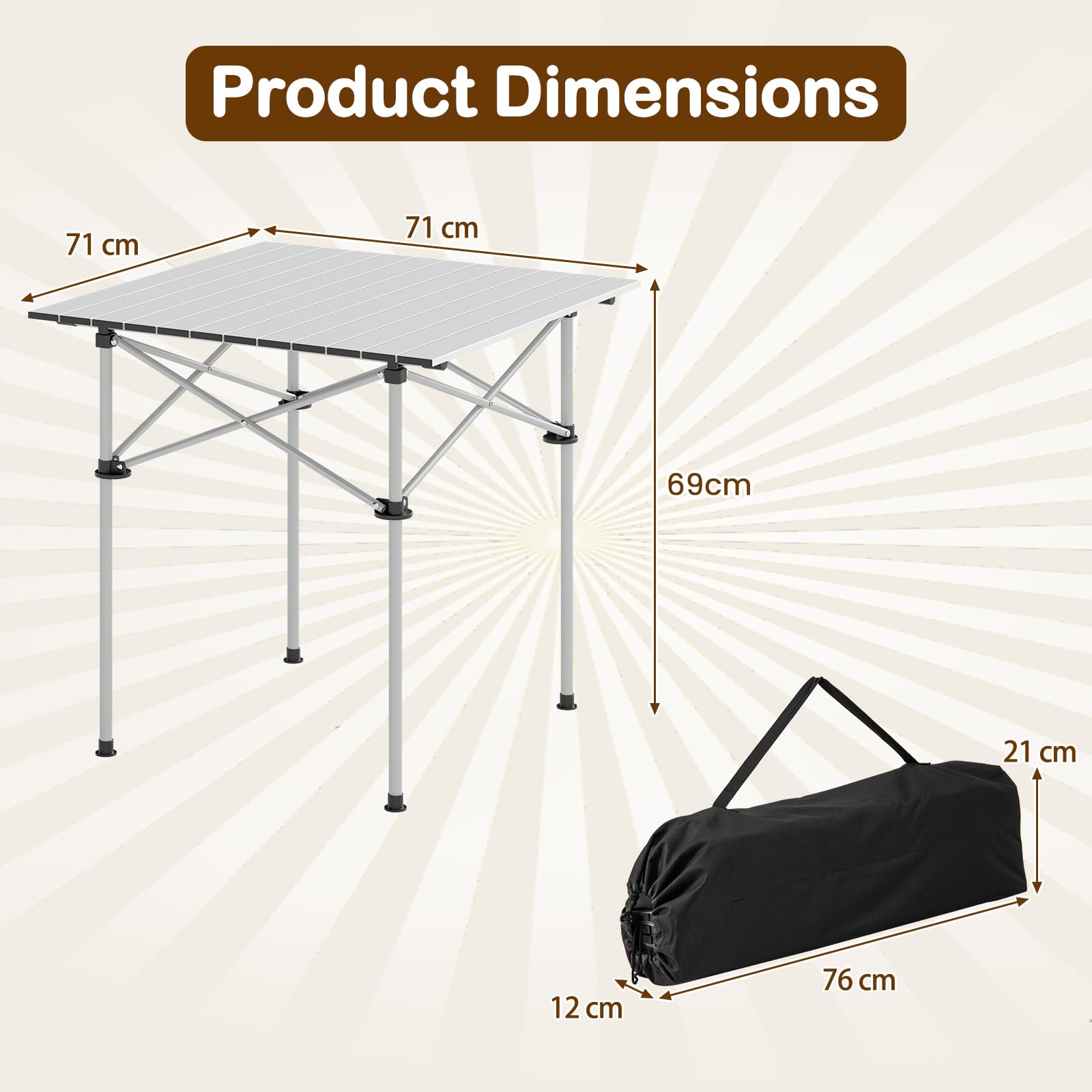 Crafted with an all-weather aluminum tabletop, the folding table promises long-lasting outdoor use. The reinforced X-shaped metal legs provide sturdy support up to 68 kg, while non-slip pads keep it stable. Moreover, the roll-up tabletop with snap lock design is simple to detach, making the picnic table quick to set up. When not in use, the square table can be quickly folded and packed into the carrying bag for easy transportation. Whether for camping, picnic, or beach trip, this well-made camping table ensures you spend more time enjoying the outdoors.