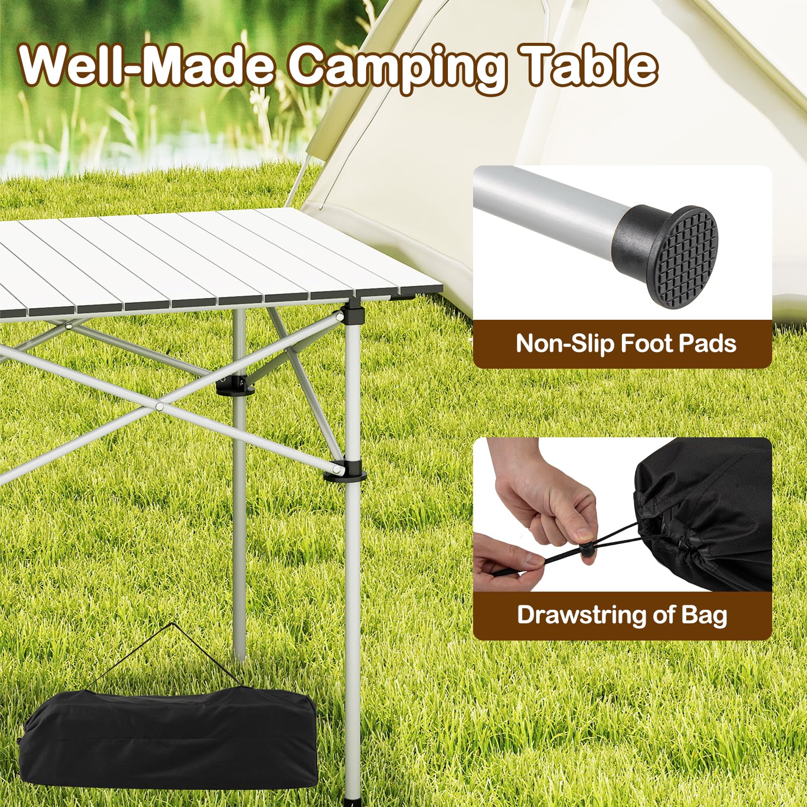 Premium Aluminum Top: The tabletop of this outdoor lightweight table is made of all-weather aluminum, which is rustproof, anti-deformation and scratch resistant for long-term use. Its smooth surface is also simple to clean.