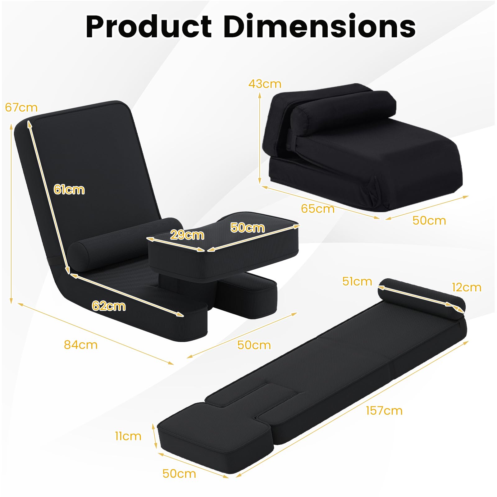 | Package Includes | 1 x Folding Floor Sofa Chair, 1 x Bolster Pillow, 1 x User Manual |