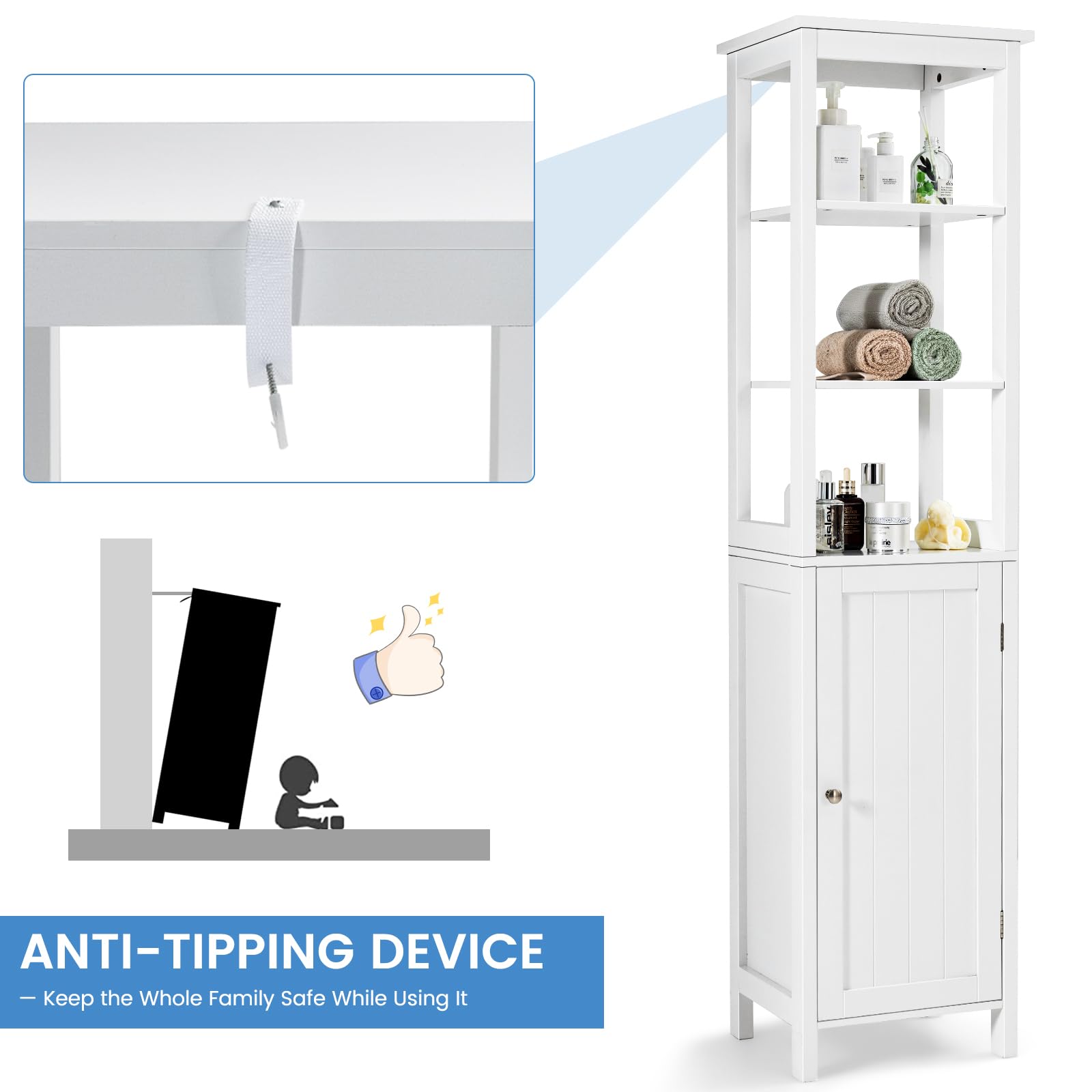 Anti-Toppling Set and Adjustable Middle Panel: Extra anti-toppling mechanism enhances using safety, and you can fix the cabinet to the wall for preventing accidents. Besides, the middle panel of the lower cabinet has 3 adjustable positions to divide the inner space into two parts, suitable for items of different sizes.