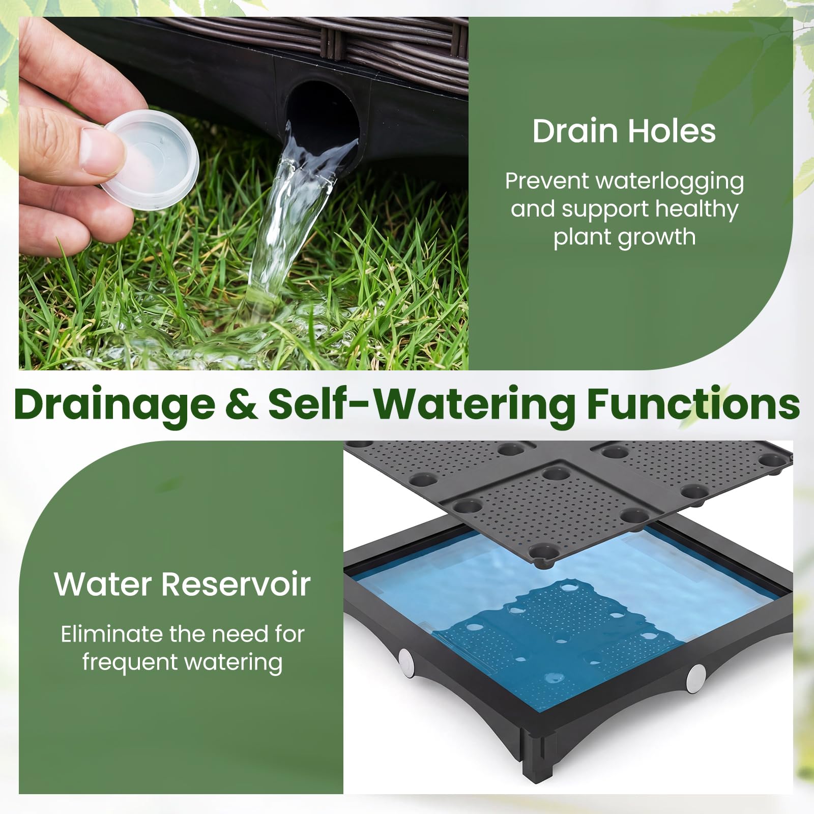 Our 2-in-1 raised garden bed measures 80 x 40 x 128 cm (L x W x H), including 2 separate planter boxes and lattice trellises, providing ample planting space and enough vertical support for various climbing plants, from vegetables and fruits to flowers and herbs. The interconnected design allows it to connect with more than 2 sets to create a larger planting area. Moreover, the planter box is equipped with a self-watering system and drainage holes, helping plants absorb water and nutrition completely while preventing water logging. Crafted from solid metal tubes with PE coating and robust PP panels, our planter box with trellis provides durability against varying weather conditions. Beyond serving as a planter, it doubles as a freestanding privacy screen, making a versatile solution for various indoor and outdoor settings.