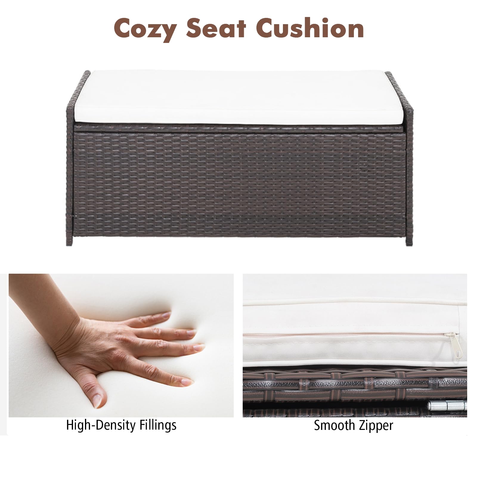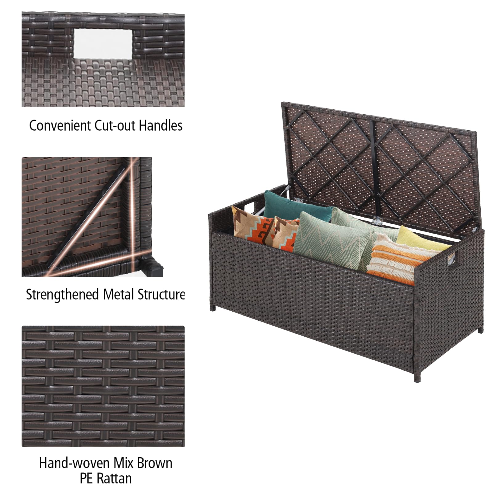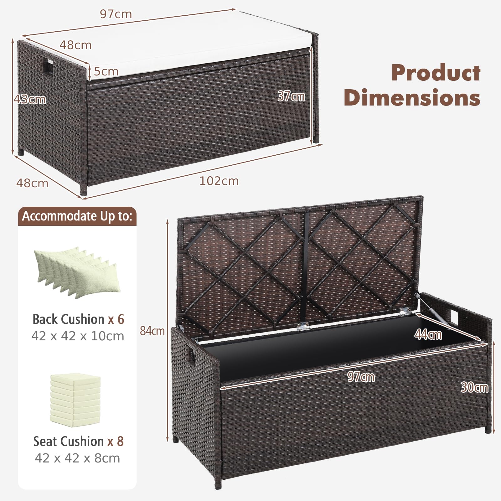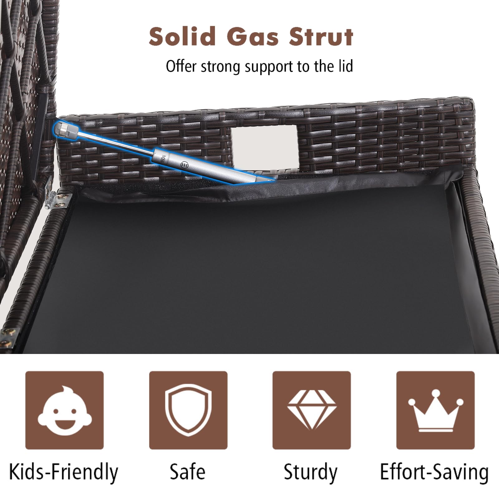 - Durable Rattan Structure: Covered with PE rattan surface, the garden storage bench can withstand longer outdoor using time. Moreover, the strengthened metal structure and solid gas strut also offers powerful support.
