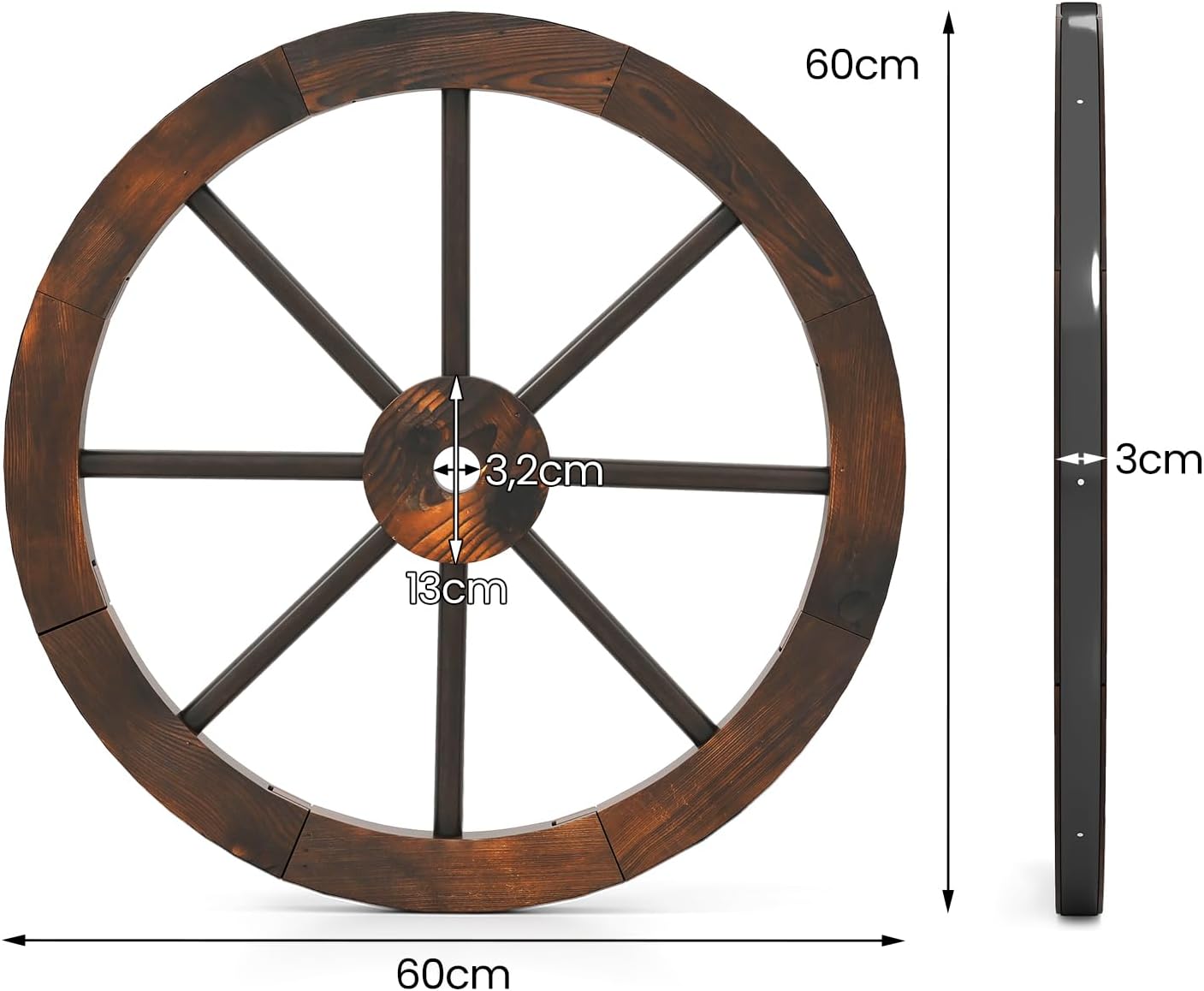 - Fine Workmanship: With the carbonization process, this wooden wheel is not easy to corrode or rot. In addition, the decorative wheel comes with 12 wooden sticks for great durability.