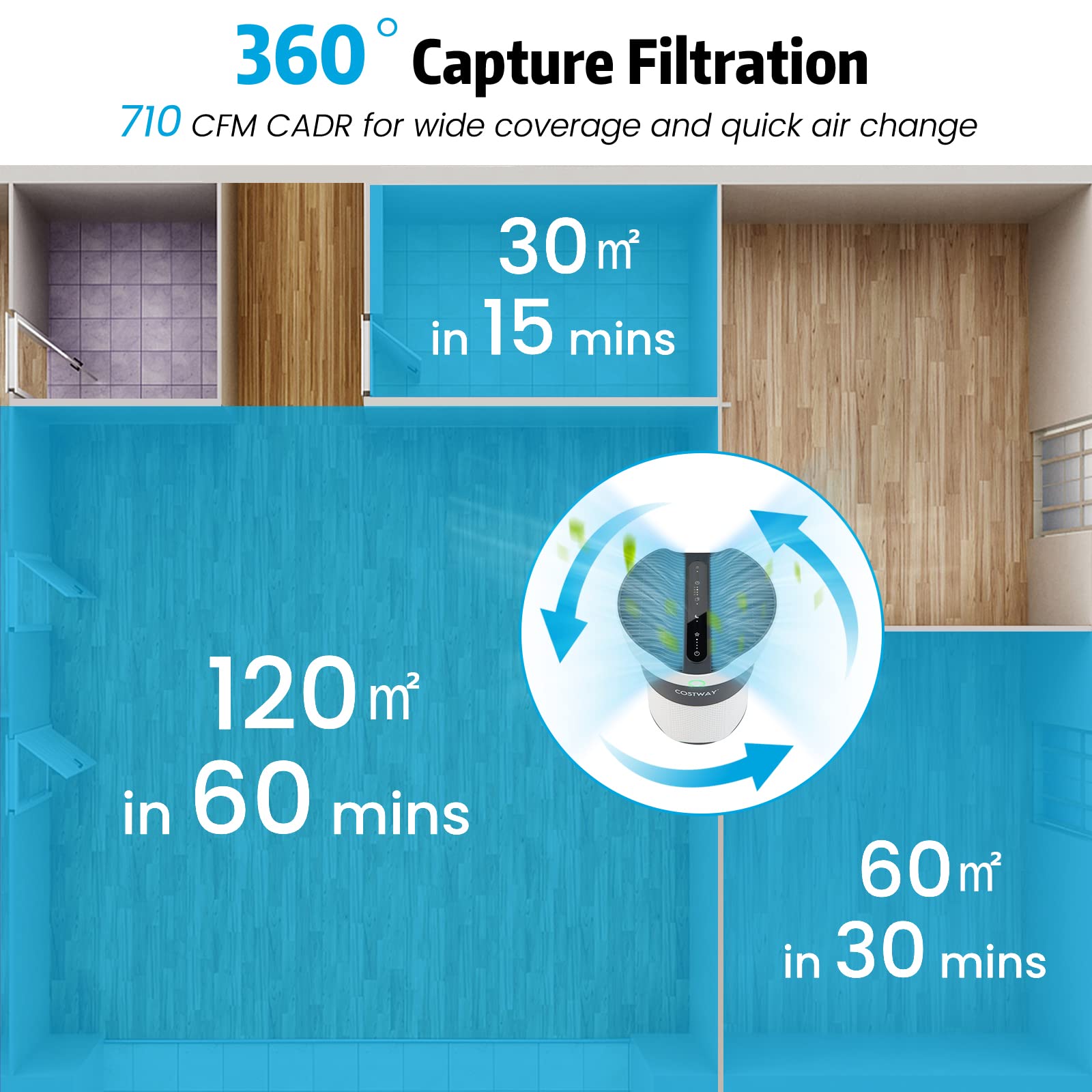 2- Featuring 360° air intake and a high CADR of 710 CFM CADR, this air filter can purify up to 120㎡ in an hour.