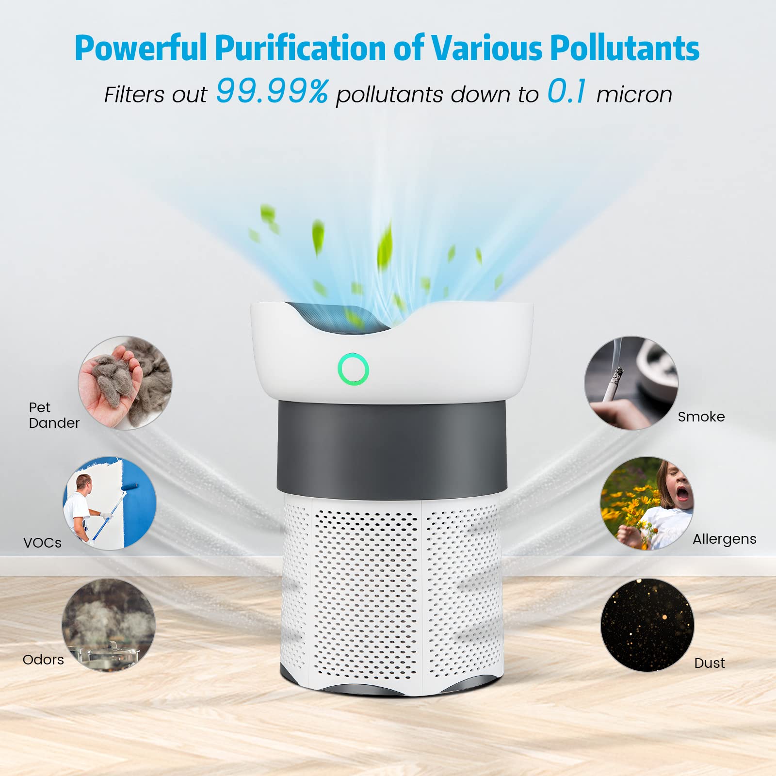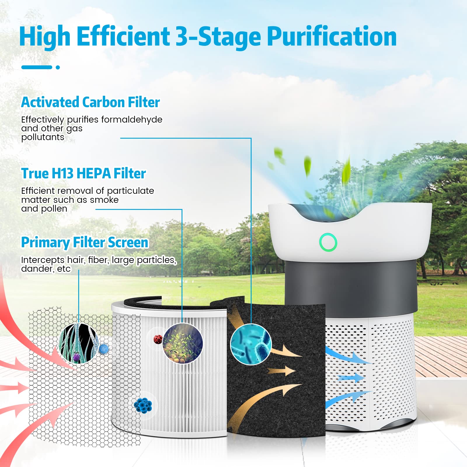 - 3-Stage HEPA Air Purifier: This air filter adopts 3-stage purification including primary filter screen, true H13 HEPA filter and activated carbon filter, which enables this air filter to filter out 99.99% pollutants down to 0.1 micron. This air filter is perfect to purify smoke, dust, allergens, pet dander, etc.