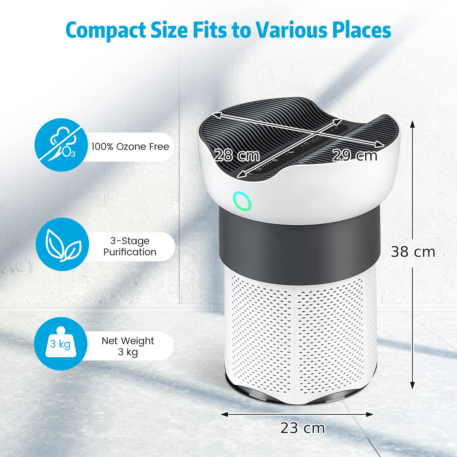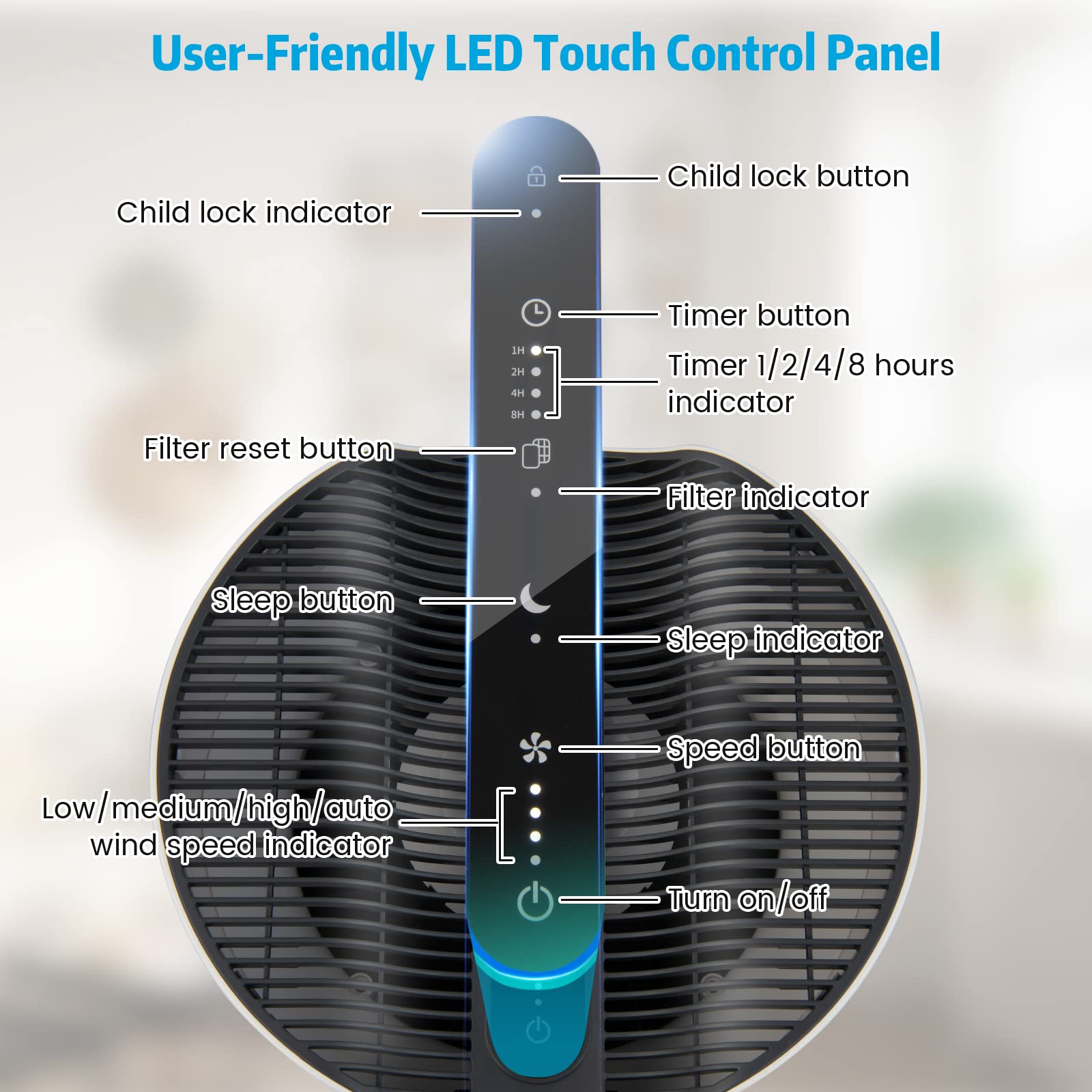 Easy to operate with touch control panel /Equipped with 3-color air quality indicator /Suitable for home, office, basement and more /Child lock function is safe for family with kids and pets /Filter replacement indicator auto turns on after 1500-hour operation