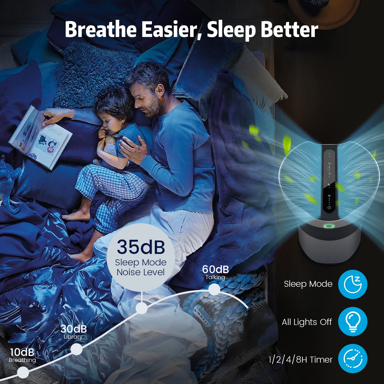 - 4 Speeds, 4 Timer Settings & Sleep Mode: This air cleaner is integrated with 4 wind speeds (low/medium/high/auto) and 4 timer settings (1/2/4/8H), meeting you various needs. In sleep mode, the air cleaner operates with a low noise level and all lights will turn off, offering you an undisturbed sleeping environment.
