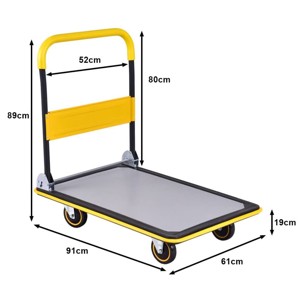 Net Weight: 12kg Color: Yellow + Black Weight Capacity: 300kg Material: Metal, Plastic, Rubber, Pu Wheel Folding Dimensions: 91 x 61 x 27cm (L X W X H) Unfolding Dimensions: 91 x 61 x 89cm(L X W X H) Package Includes: 1 x Folding Push Cart, 1 x User’s Manual