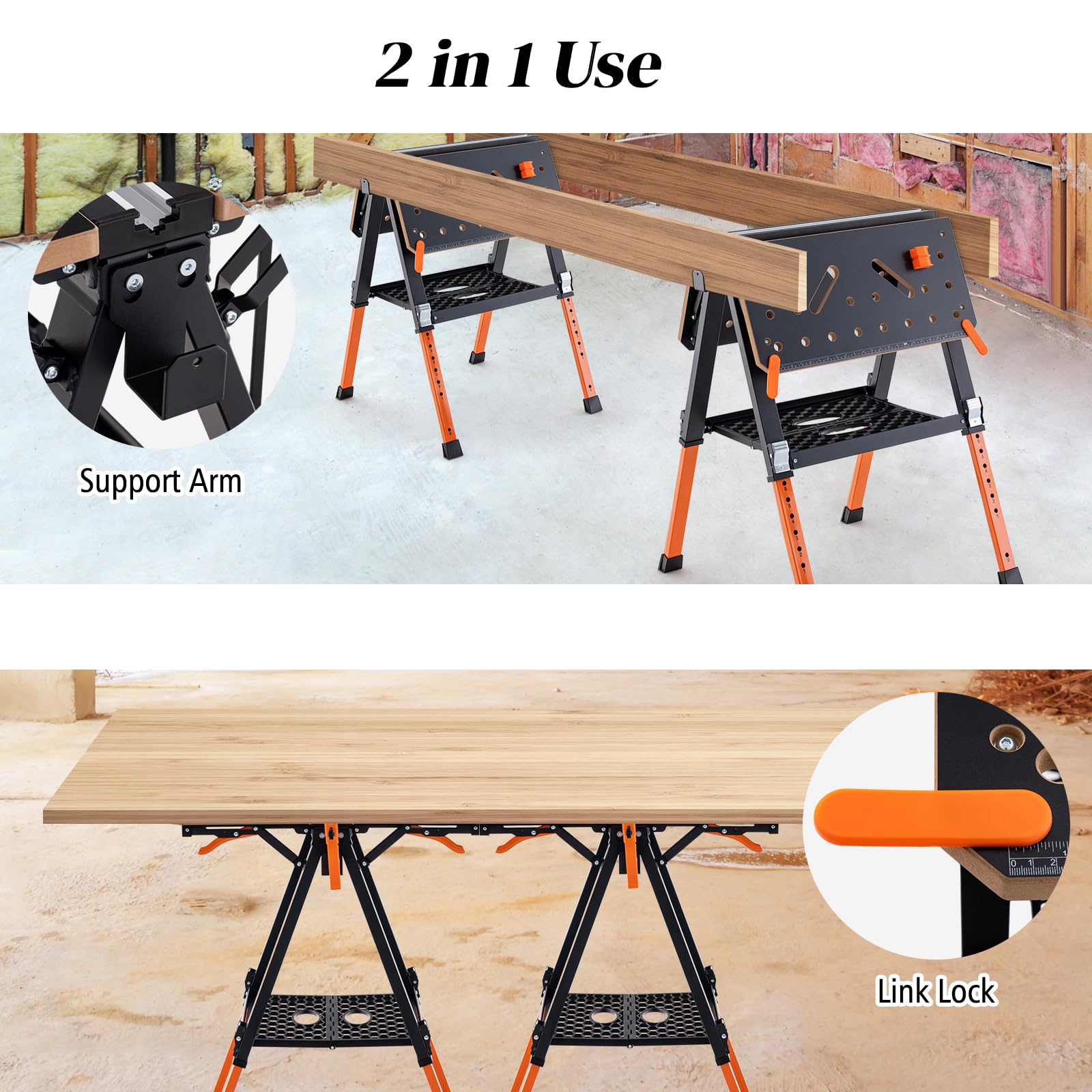 - 2-in-1 Worktable: Because of the folding tabletop, this workbench can also be used as a sawhorse. In addition, the lower shelf provides addition space for your tools and other items in order.
