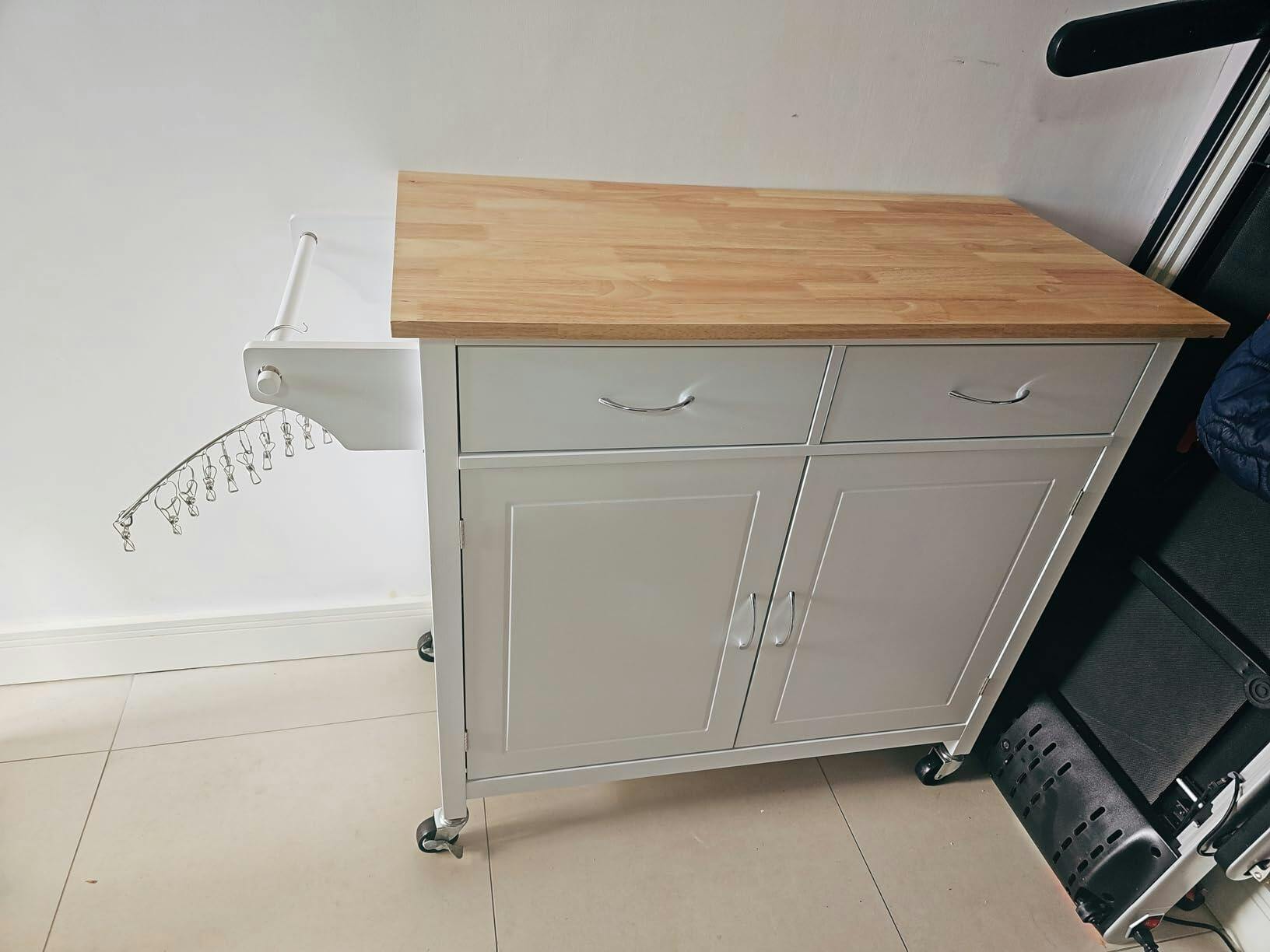 - Solid Construction: Adopting premium rubber wood , the countertop is durable and sturdy to guarantee excellent performance in long-term use. In addition, the storage cart consists of P2 MDF board and the surface is coated with paint.