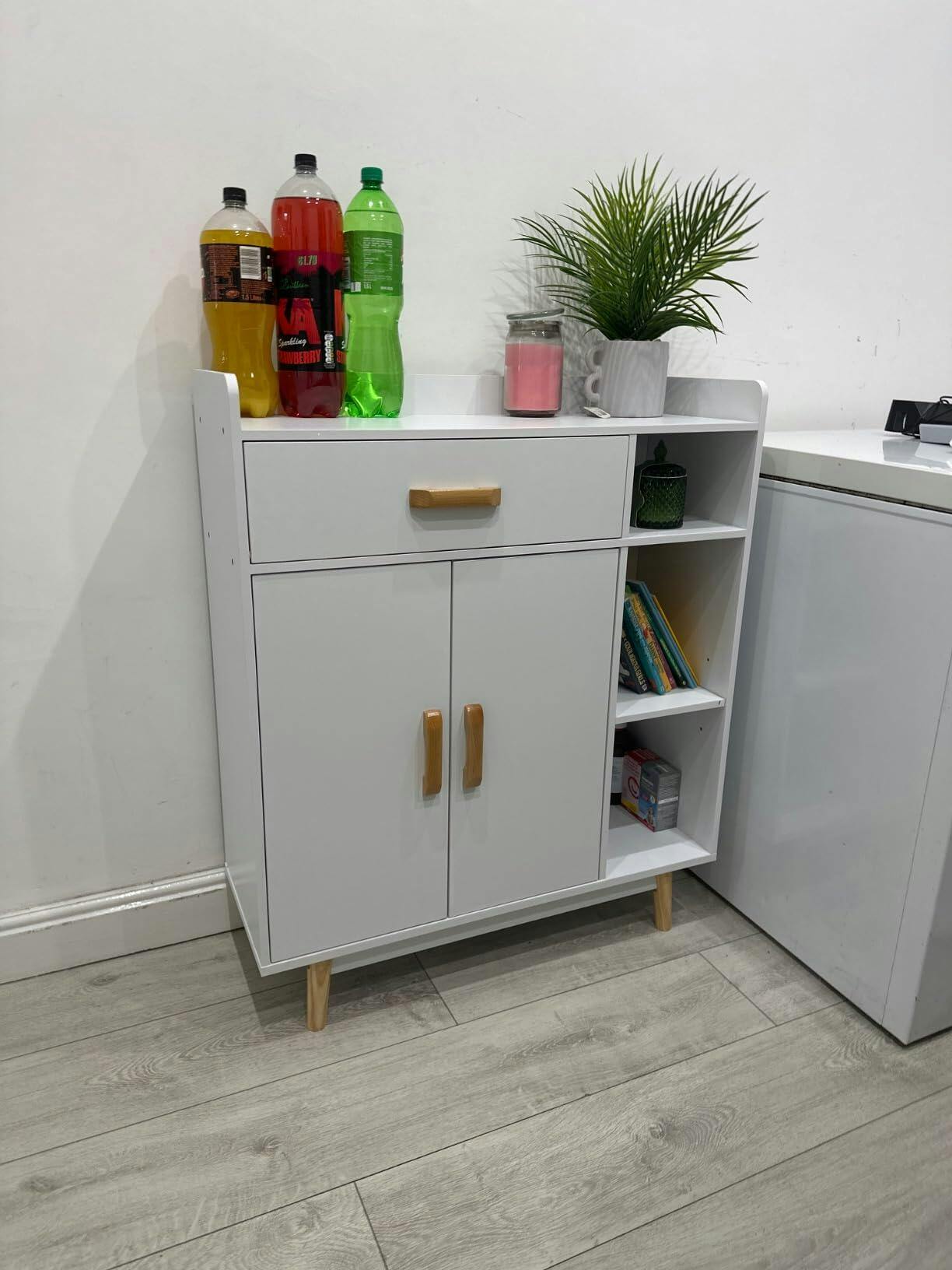 I have been looking for more storage space for our kitchen and this sideboard is a perfect addition. It is easy to build up just following the instructions. I'm proud that I assembled this entirely myself, and it sure is pretty. The finish is smooth and odourless and the quality of the material is excellent. It looks beautiful and will make my kitchen look organised and nice.