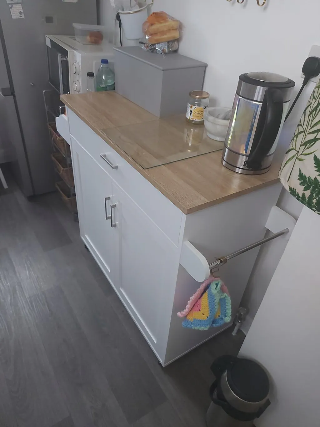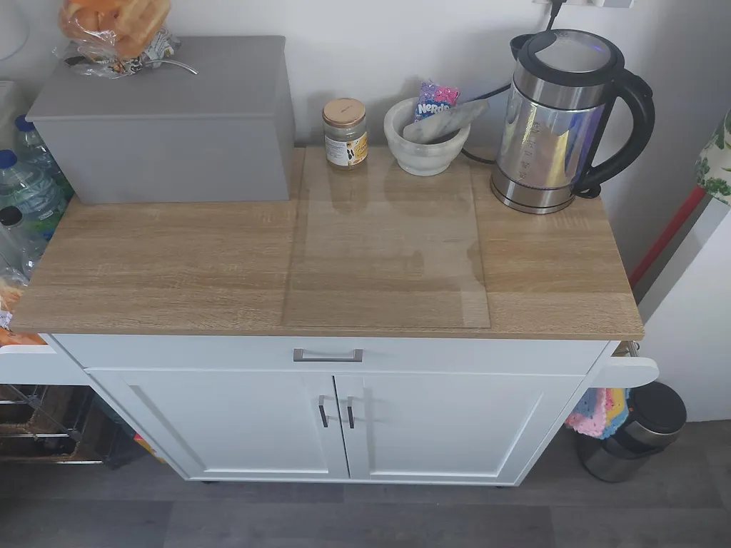 - Sufficient Storage Space: Our kitchen storage island has an ample cabinet, a large drawer and a spacious table top for people to place tableware, fruits, drinks and so on. In addition, the shelves on the left and right sides can be used to hang rags or towels, as well as cups and spice bottles.