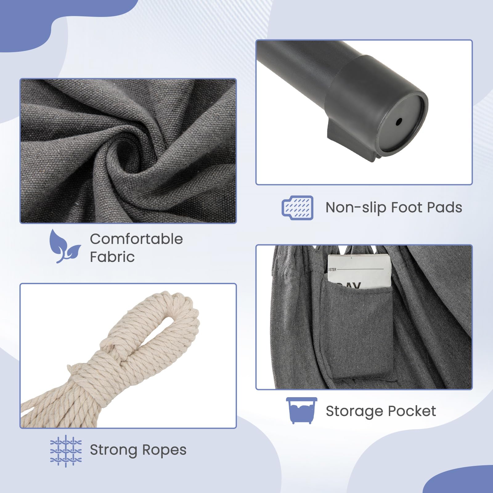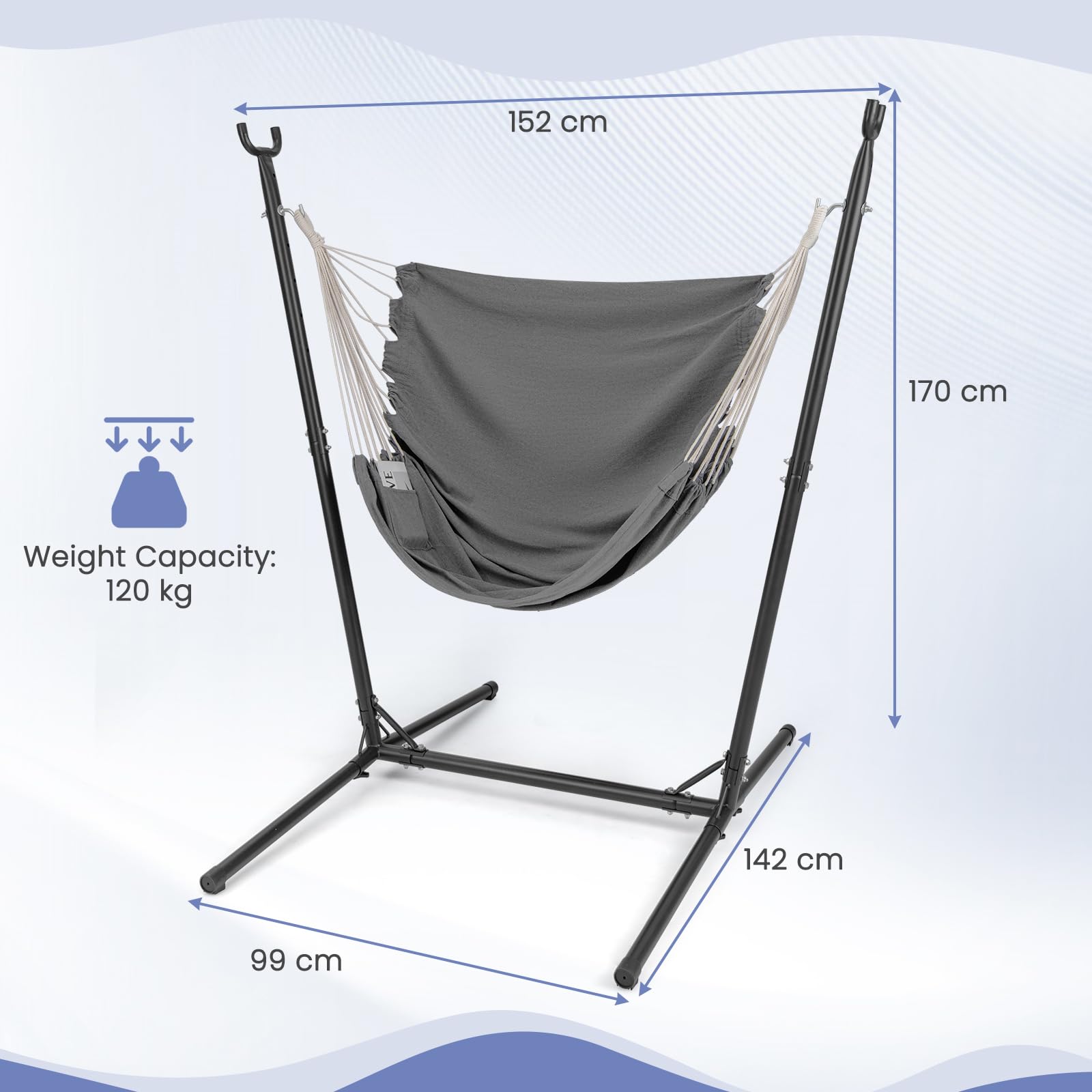 Boasting a 6-level adjustable height design, this swing chair offers flexibility in relaxation customization. Made with skin-friendly fabric, the hanging chair provides a cozy seating experience that beckons you to unwind. Its stable construction, including an H-shaped base and triangular support structures, ensures a secure and steady foundation for your relaxation. Additionally, you will love the added convenience of a side pocket for storing essentials and tidying space. Whether you are lounging indoors or outdoors, this hammock chair with stand is the ideal retreat for you to relax and savor the moment.