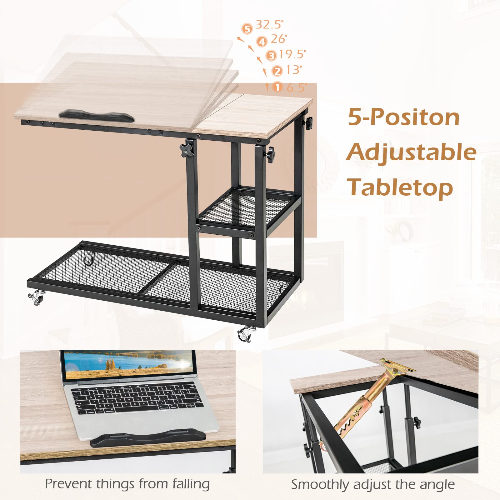 C-Shaped Frame with Storage Shelves: Unique C frame allows this table to slide over bed or sofa for an easy-to-use laptop, computer or tablet, making you read books, enjoy food and dessert while sitting on sofa. Also, the mobile table is equipped with 2-tier open shelves, which offer storage space for your commonly used items.