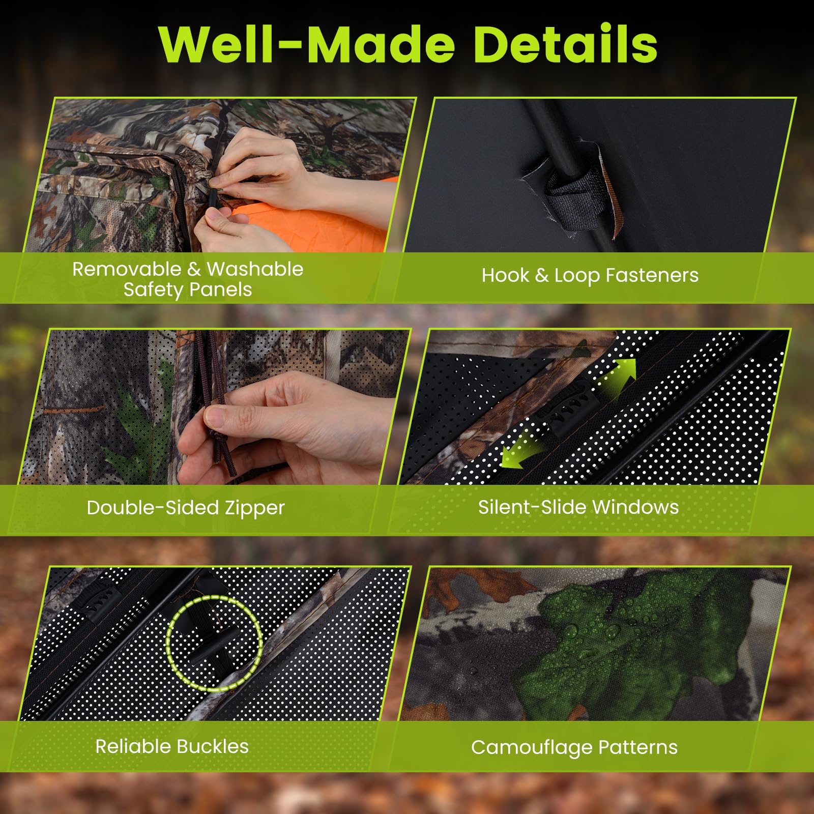 Well-Made Details & Spacious Capacity: Enjoy a cleaner and safer hunt with removable, washable safety panels and a robust double-sided zipper for quick, reliable access. Spacious enough for 2-3 hunters, this hunting blind is perfect for solo trips or teamwork, ensuring you have room for gear and companions.