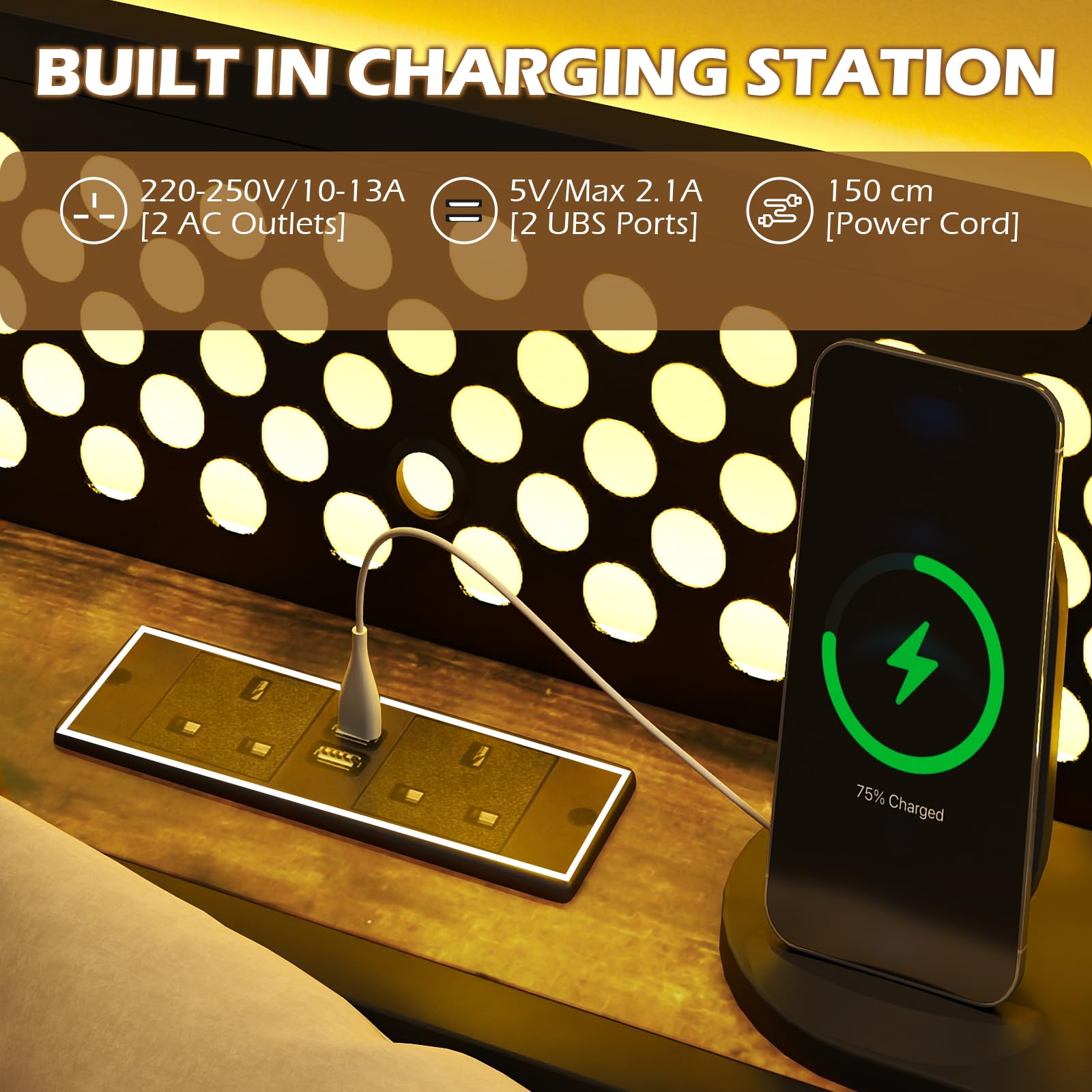 Built-in Power Outlets: Keep your devices charged and ready with the built-in power strip, including 2 AC outlets and 2 USB ports. Conveniently located on headboard, it maintains a tidy space with easy access to charging, right where you need it.