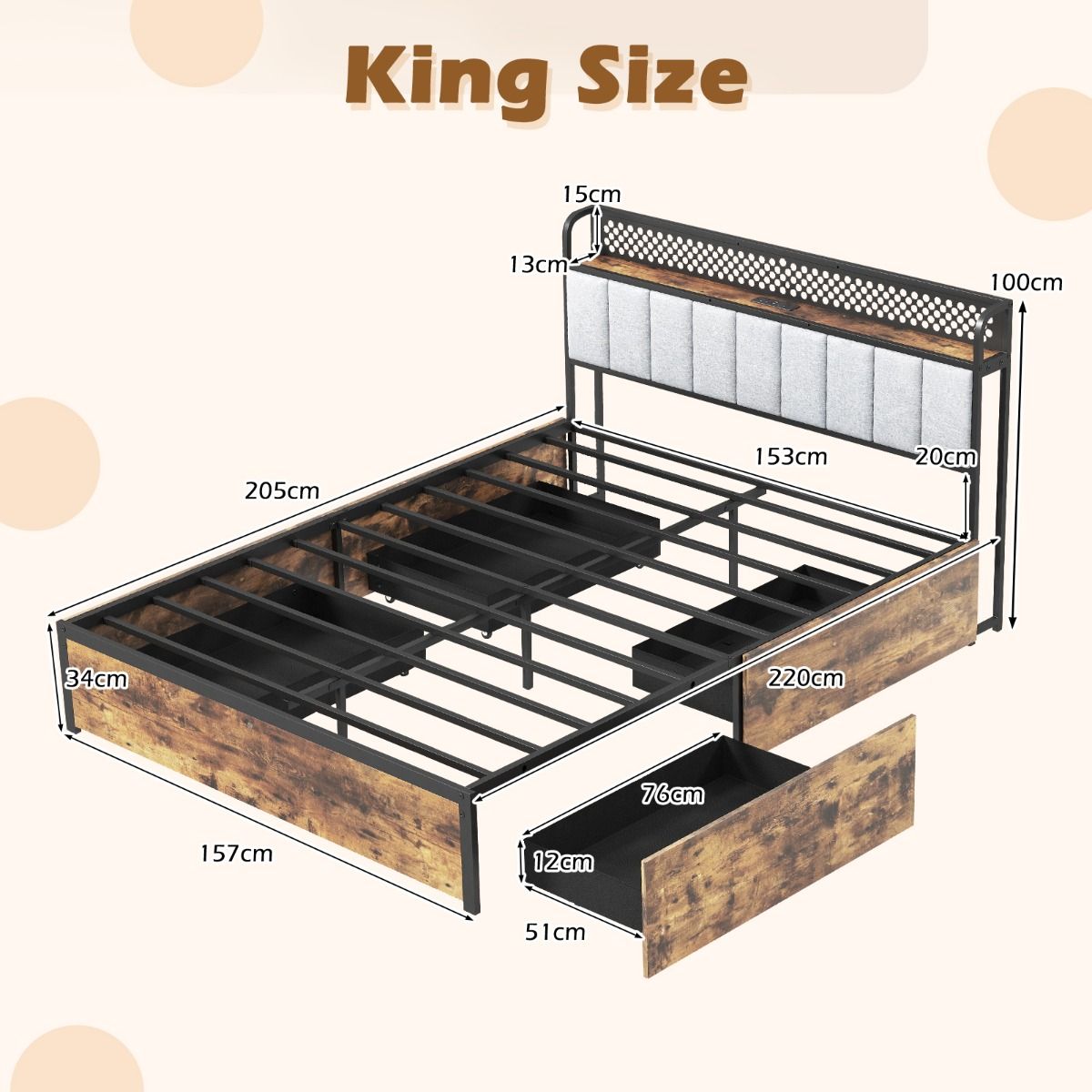 Style Meets Comfort: Indulge in the plush design of the upholstered headboard, adding a touch of luxury to your bedroom. The metal bed frame also features warm wood grain finish to create an inviting atmosphere.