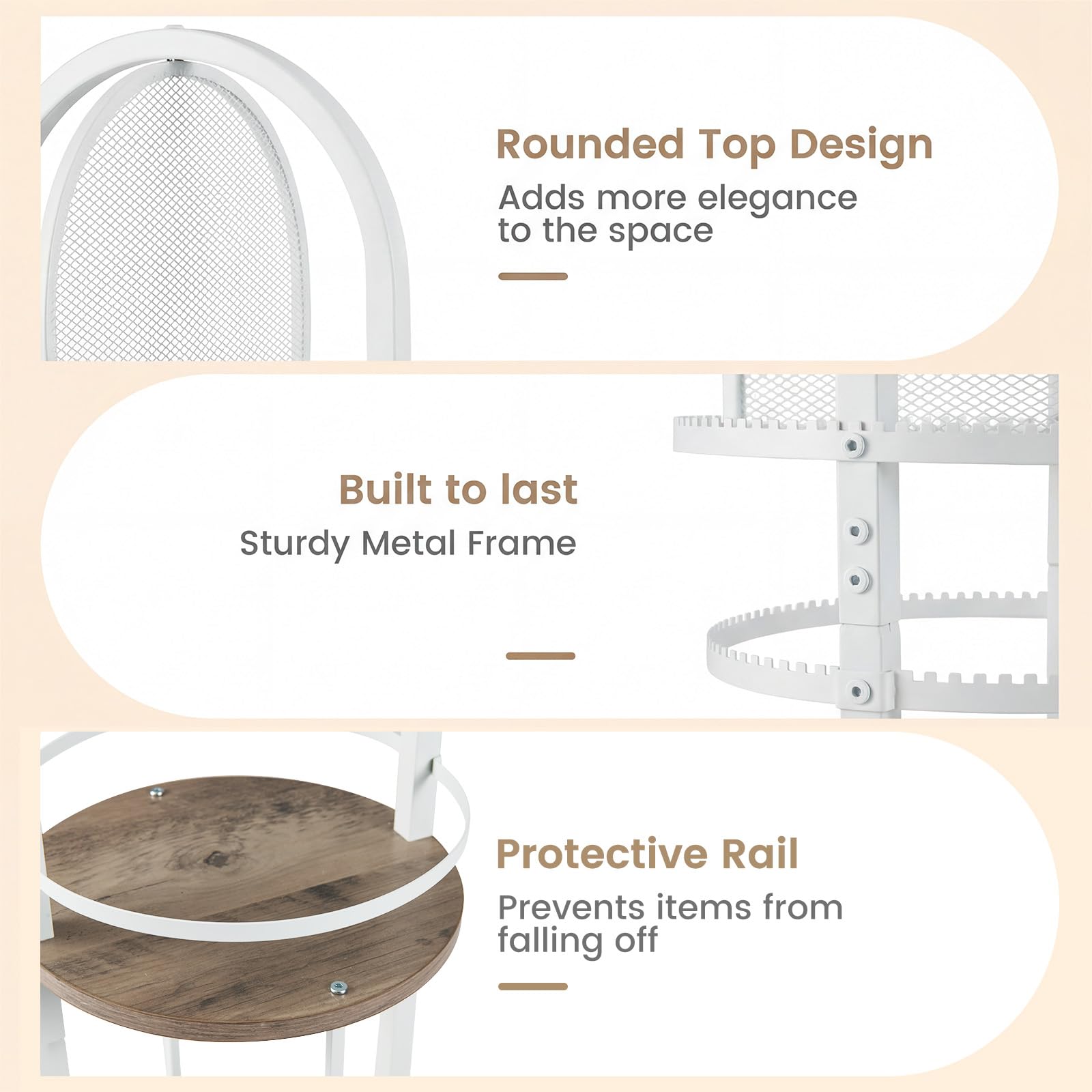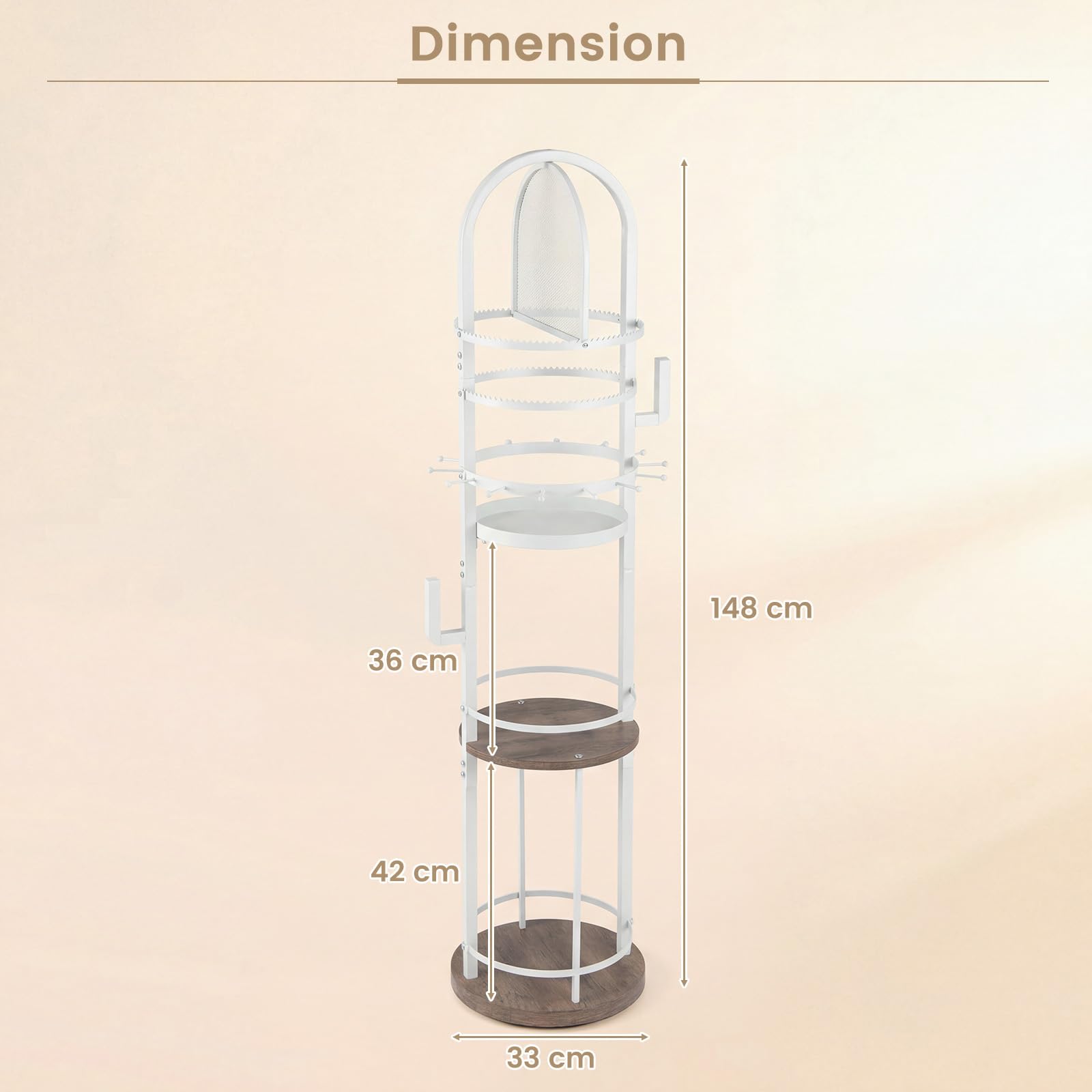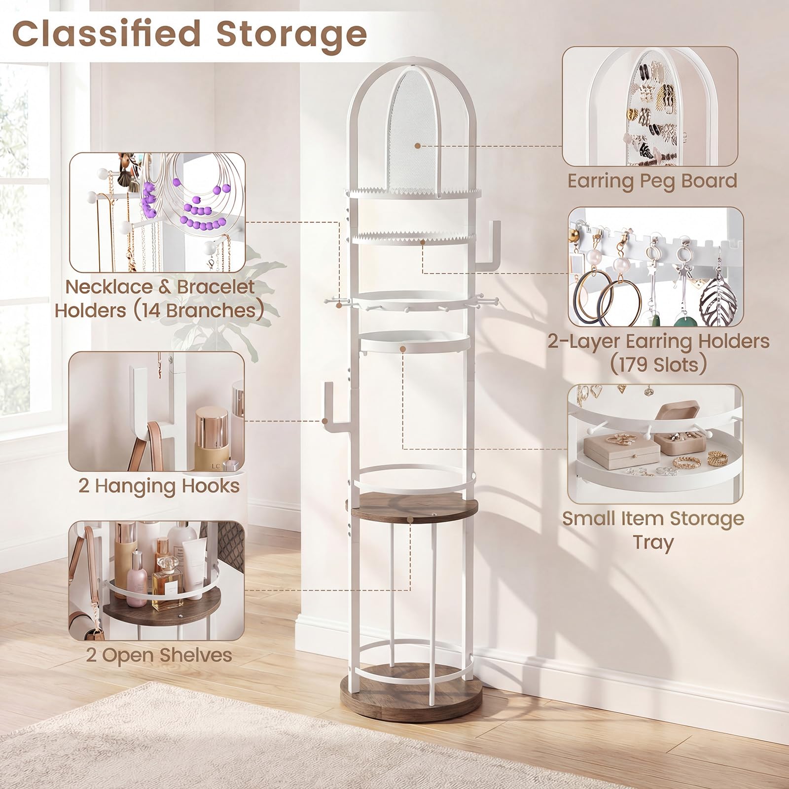 Keep your jewelry collection beautifully organized with this all-in-one storage organizer! This standing jewelry organizer features a earring peg board, 2-layer earring holder, necklace and bracelet holders with 14 branches, 2 hanging hooks, a small storage tray, and 2 open shelves. With a compact footprint, this jewelry tree organizer saves space on countertops, vanities, or dressers, maximizing organization even in smaller areas. The 360° rotating base provides easy visibility and quick access to all your pieces. This jewelry tree stand is a wonderful choice for bedrooms, dressing rooms, or dorms, and makes a thoughtful gift for your loved ones.