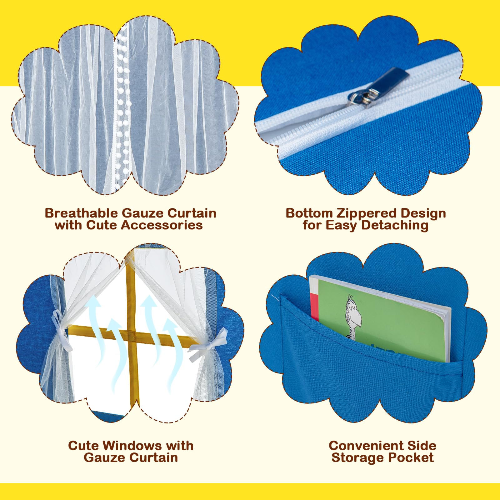 Multipurpose Design and Easy Assembly: This playhouse serves as a versatile play area, which is perfect for parties, picnics, taking a nap, playing games, reading books, or even as a private space for kids to enjoy their favorite activities. It can be used for birthdays, carnivals, sleepovers, and more. Whether placed in the bedroom, kids play room, family room, it can be a perfect choice.