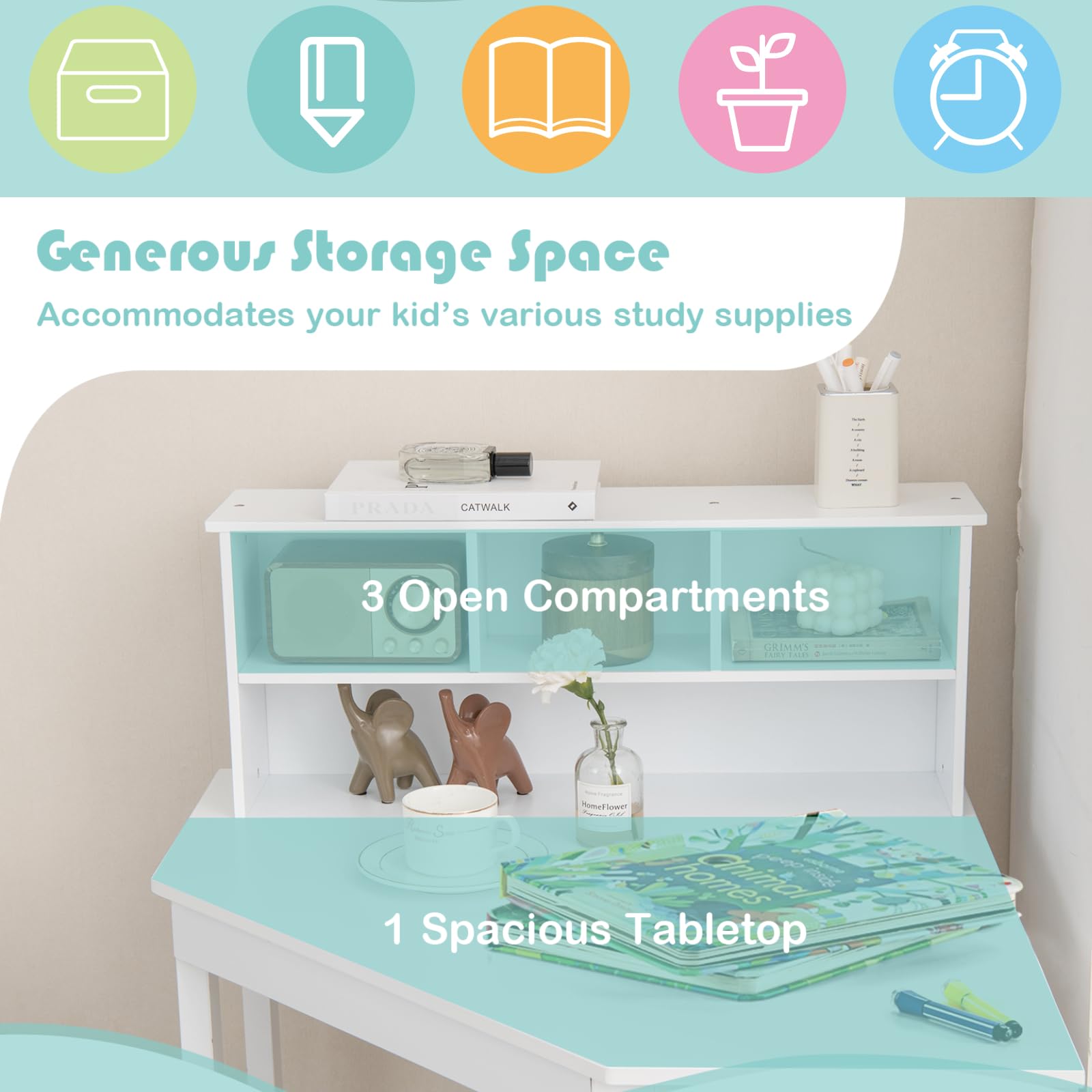 Large Storage Space: The tabletop offers enough space for kids to study. More importantly, the raised storage cubbies hold study supplies for easy access, such as books, notebooks and stationery. Meanwhile, the top area accommodate other items like clocks and potted plants.