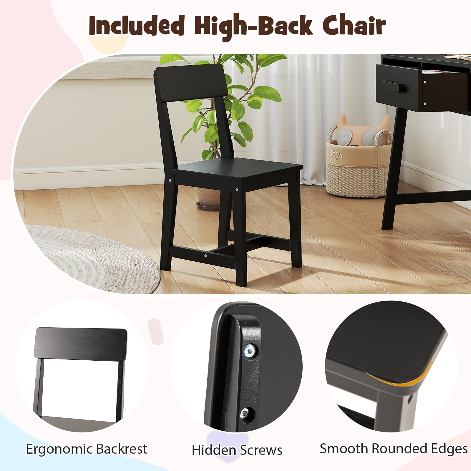 Ergonomic Chair with Backrest: The wooden children table set comes with a matching chair that features a slightly inclined backrest. This design helps cultivate kid’s good sitting postures, promoting comfort and reducing the risk of back pain during long study sessions.