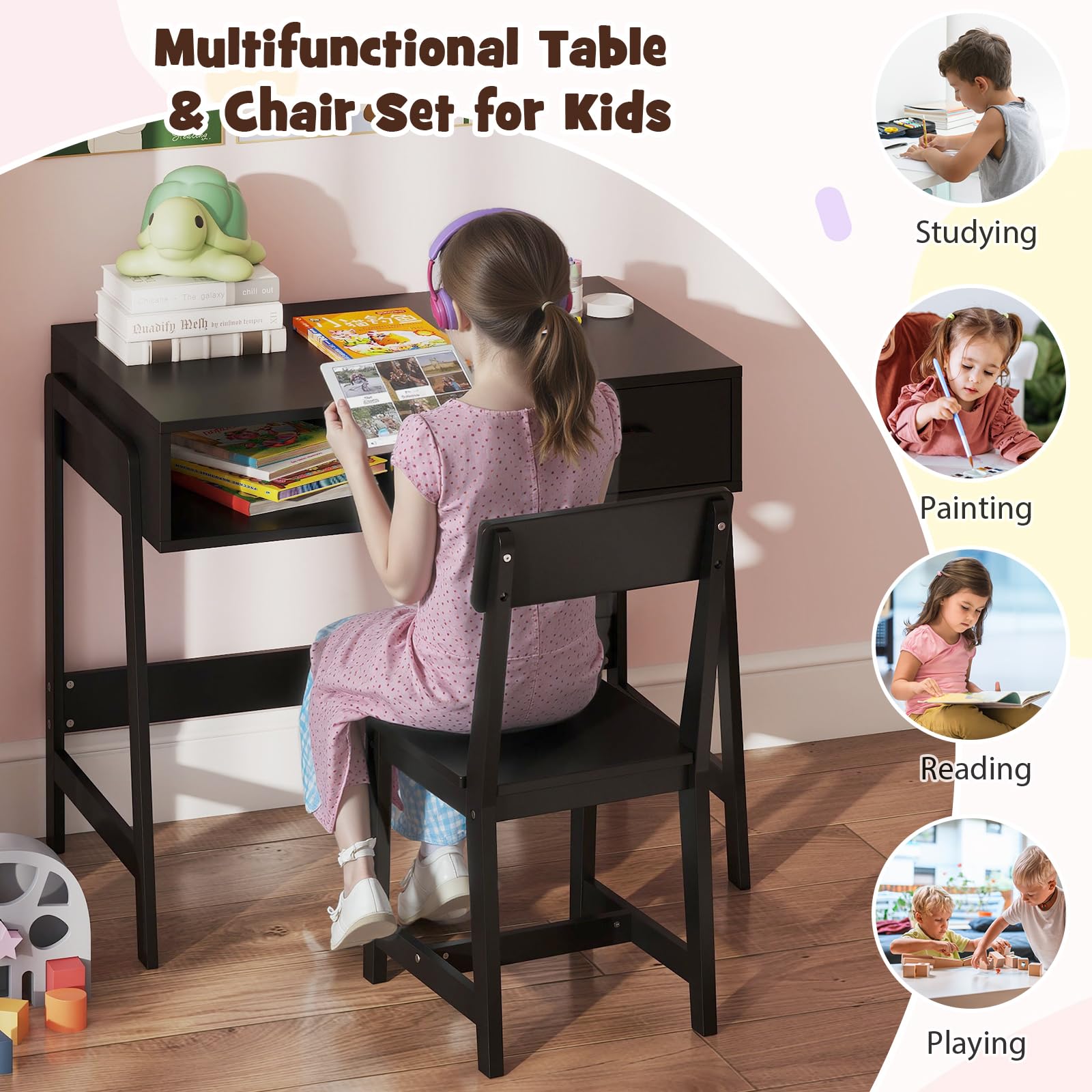 Ample Storage Space for Study: The large tabletop provides ample space to hold kid’s lamp, books, stationary etc. The open compartment under the table keeps school supplies, toys, snacks within reach. Plus, the pull-out drawer offers enclosed storage space for kid’s private items.