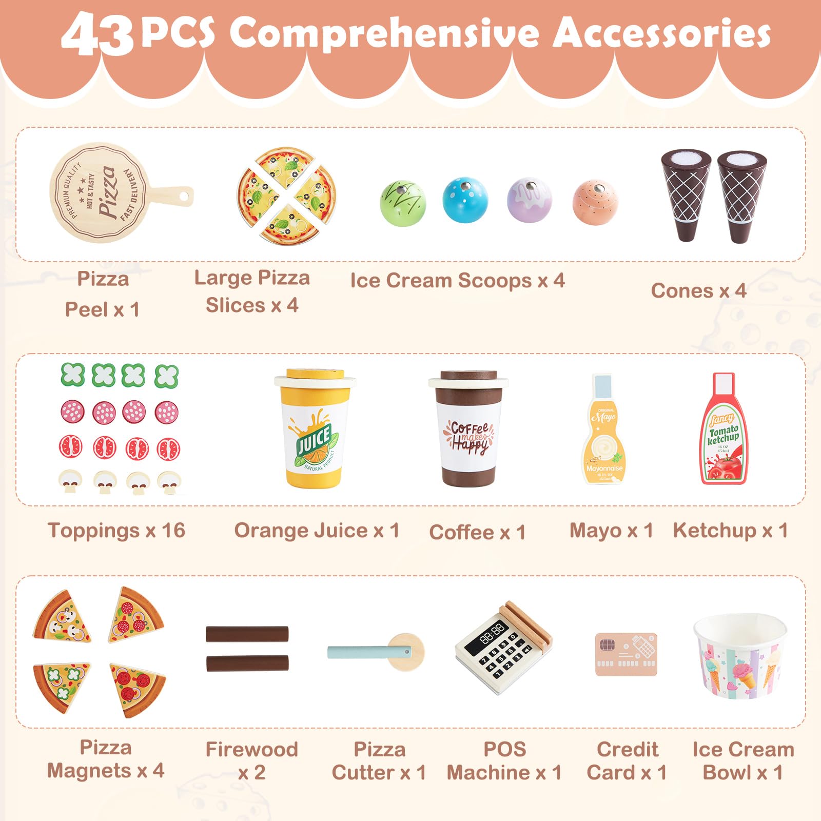 More Than Just Pizza: Beyond pizza, the wooden snack cart features an adorable canopy and a selling window to display ice cream, coffee, and juice. A magnetic blackboard adds extra play value with 4 pizza magnets that can be stuck and swapped anytime.