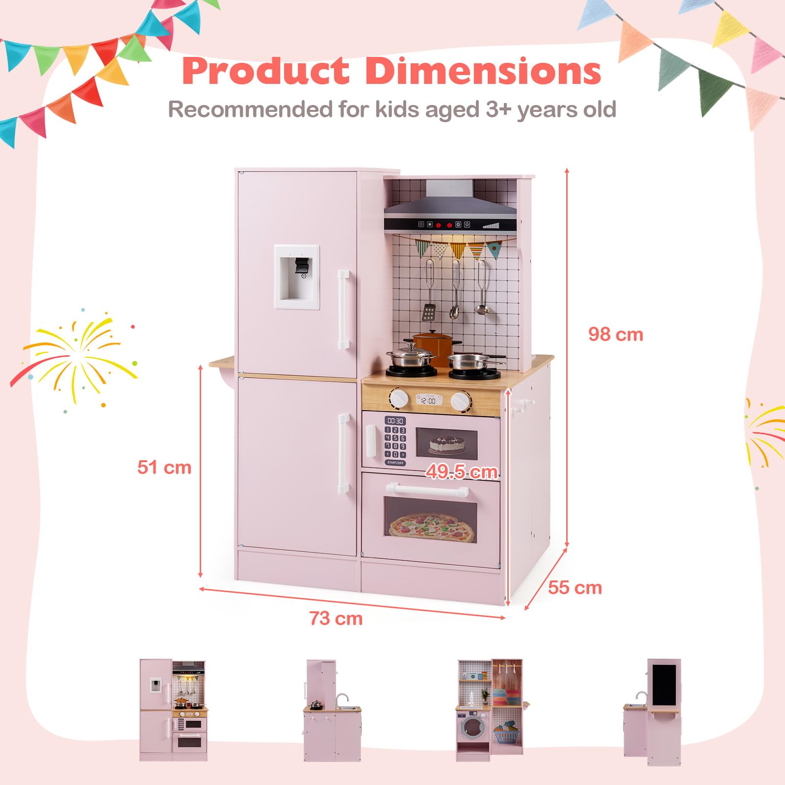 - Cute patterns make the play kitchen visually engaging for children
