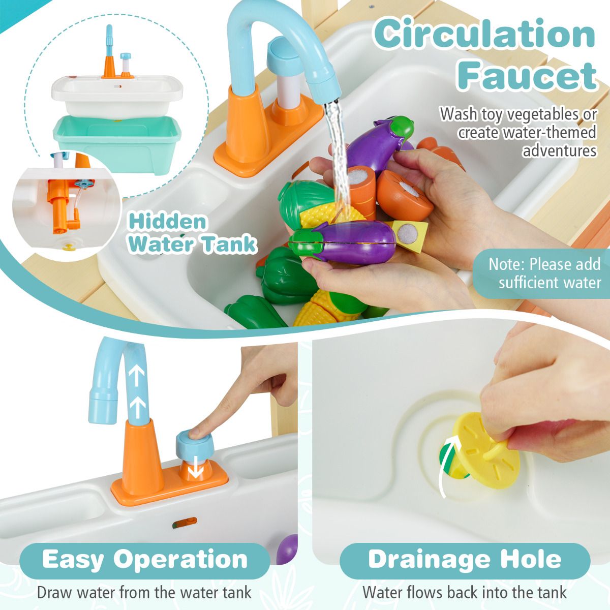 Water Play with Circulation Faucet: Enhance sensory play with a removable sink and a circulation faucet. Kids can press a button to draw water and open a drainage hole to let it flow back, enhancing their outdoor playtime. Note: Please add sufficient water.