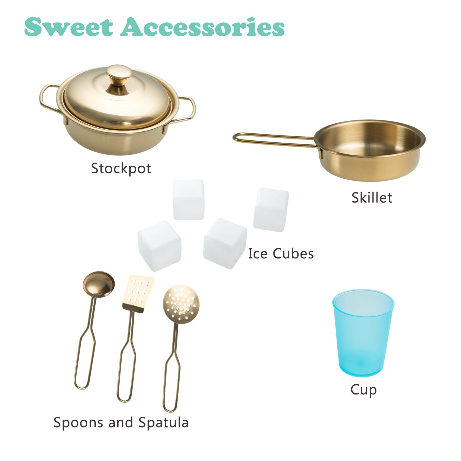 • Rich Accessories & Storage Space: The toddler toy kitchen comes with 4 ice cubes, a cup, spoons, spatula, pan and pot. All the accessories and even other items can be put orderly in the diverse storage space, which will help kids to cultivate the good habit of sorting and organizing.
