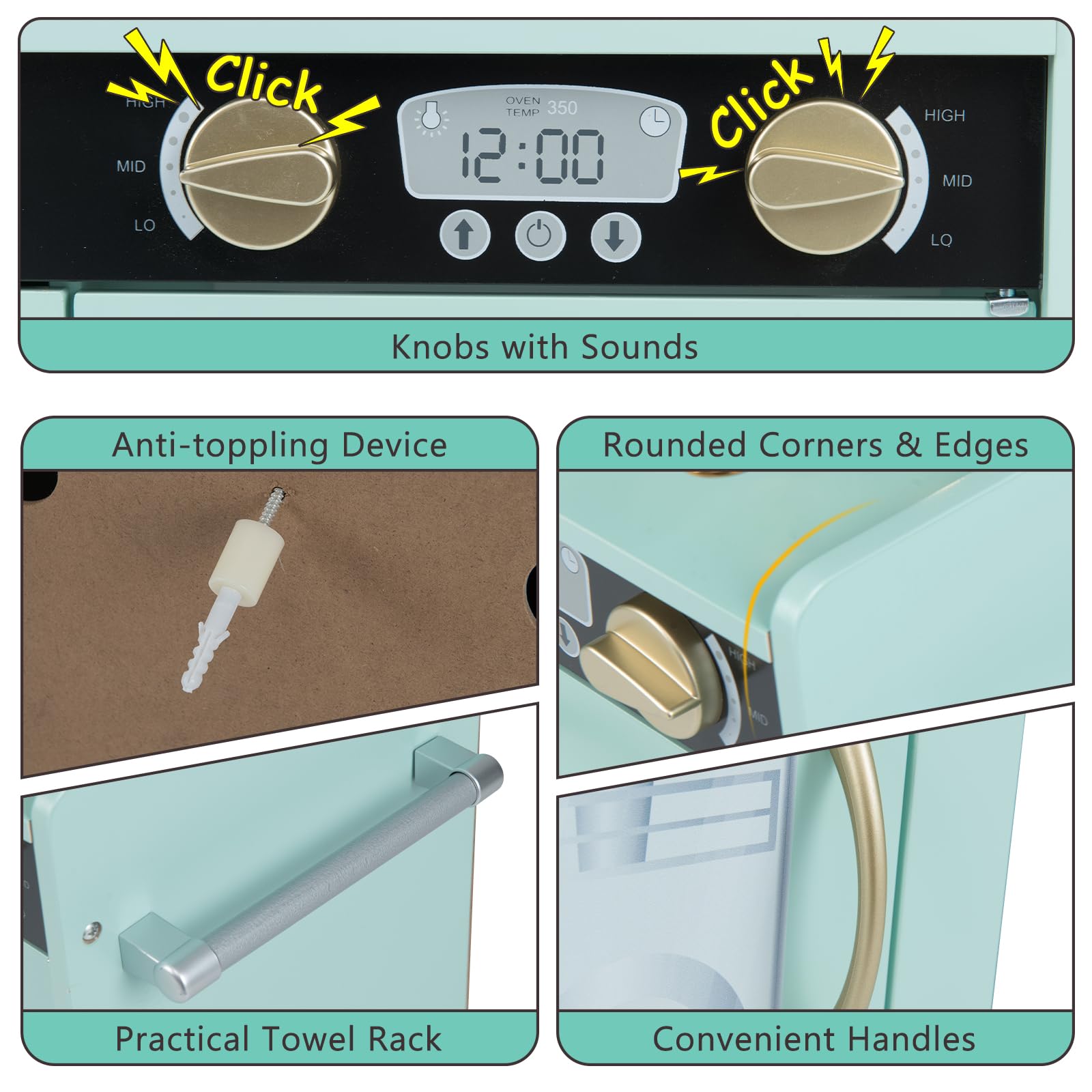 • Quality Material & Structure: Crafted from BPA-free material, this children pretend kitchen is durable and safe for long-time use. Additionally, the equipped anti-toppling device attaches the kids kitchen to the wall tightly, avoiding accidental falling.