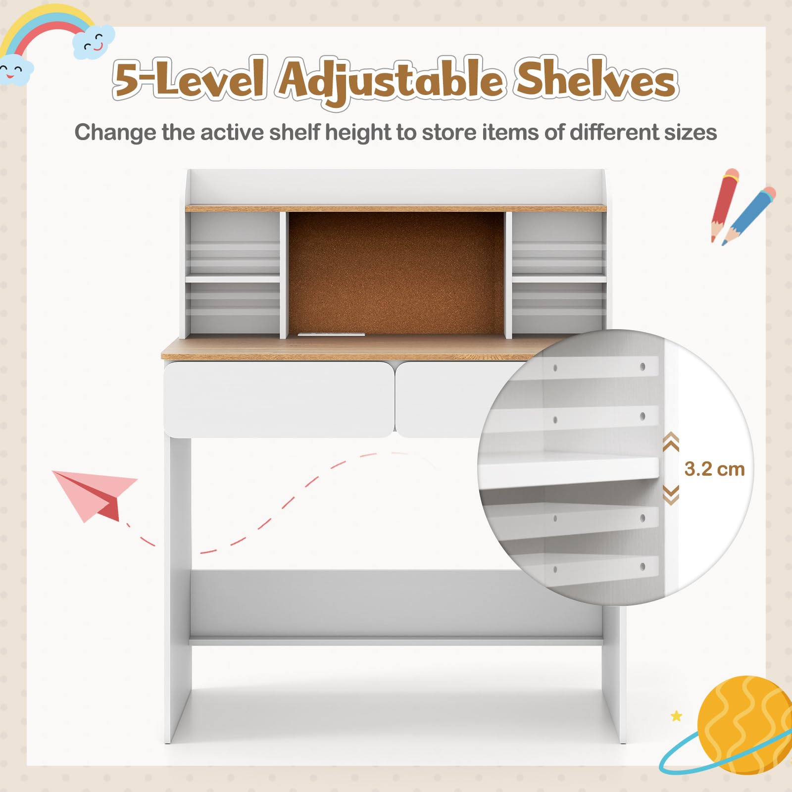 Ample Storage Space: Featuring 2 hutch with active shelves, 1 wide desktop, 1 bottom shelf, and 2 large drawers, the study desk keeps kids’ items neatly organized. The active shelves can be adjusted in 5 positions to hold items of different heights.