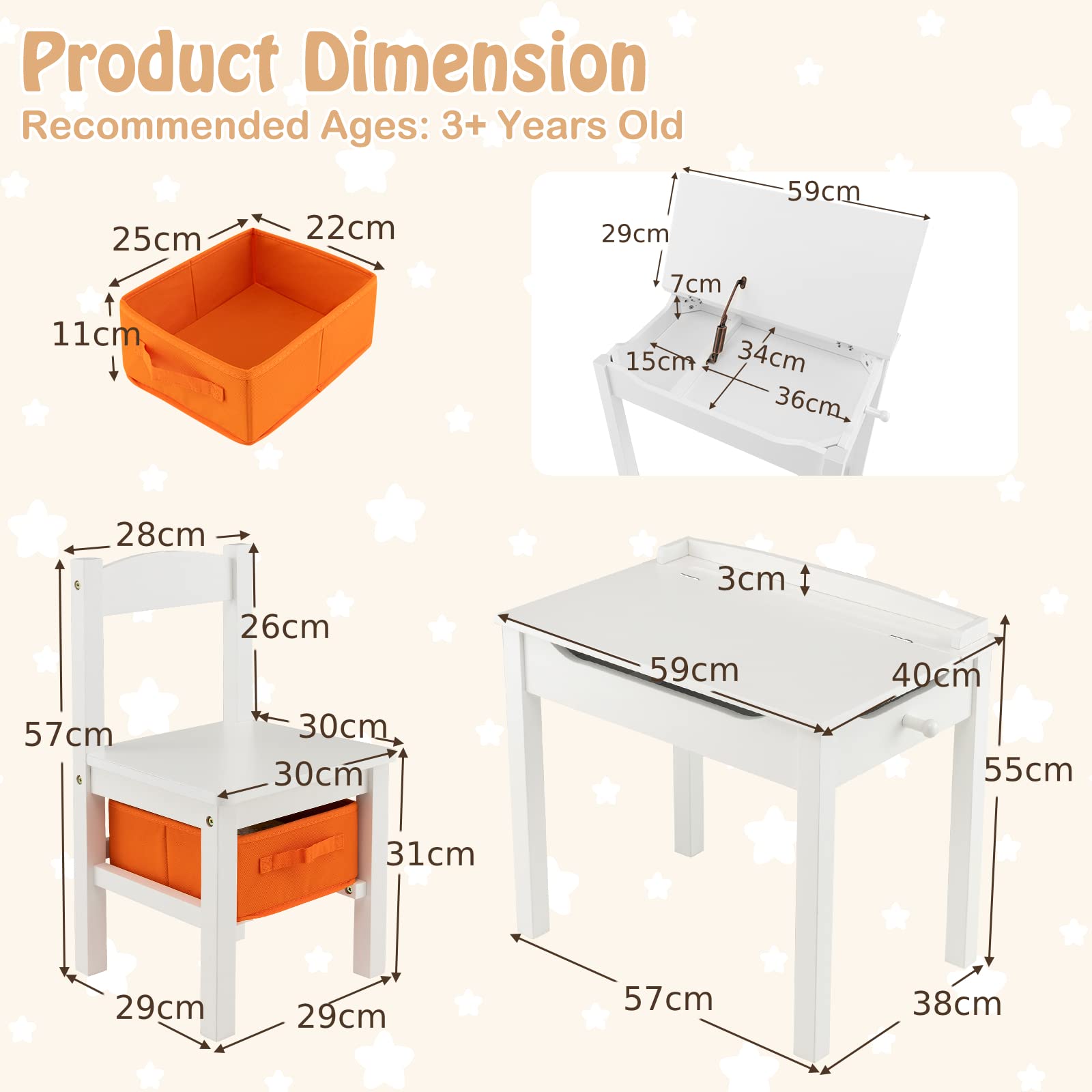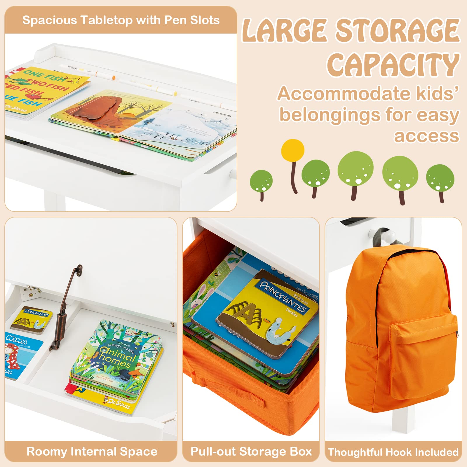 Safe Flip-up Desktop: Featuring a flip top design, there is a large storage space under the desktop. The humanized notch design avoids hand clamping, and the safety slow-dropping hinge prevents the desktop from sudden closing. In addition, the anti-falling baffle and pen slot on the desktop keep kids' pens or pencils in place.